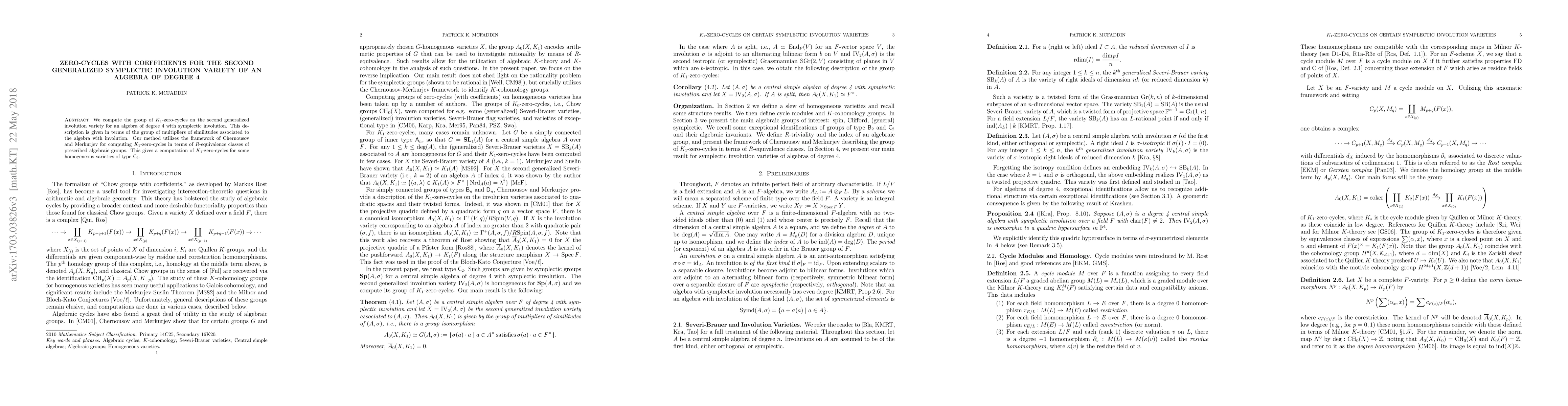 This paper computes the group of $K_1$-zero-cycles on the second generalized involution variety for a degree 4 algebra with symplectic involution, using the framework of Chernousov and Merkurjev. The result is expressed in terms of the group of multipliers of similitudes associated with the algebra.