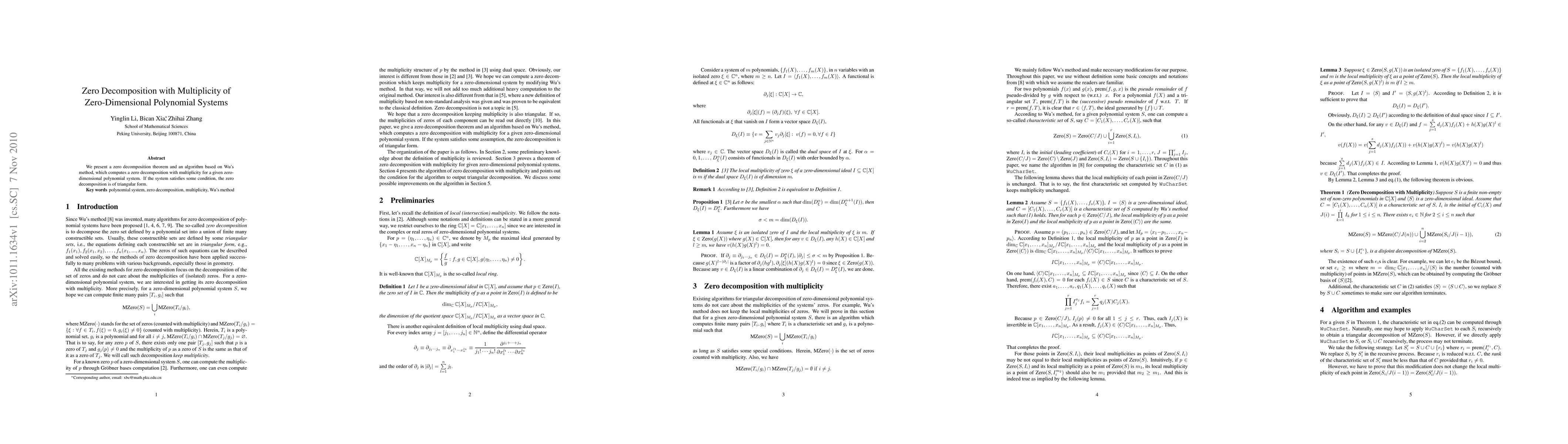 Summary: This paper introduces a zero decomposition theorem and an algorithm based on Wu's method for determining the zero decomposition with multiplicity for zero-dimensional polynomial systems. Under certain conditions, the decomposition takes a triangular form.