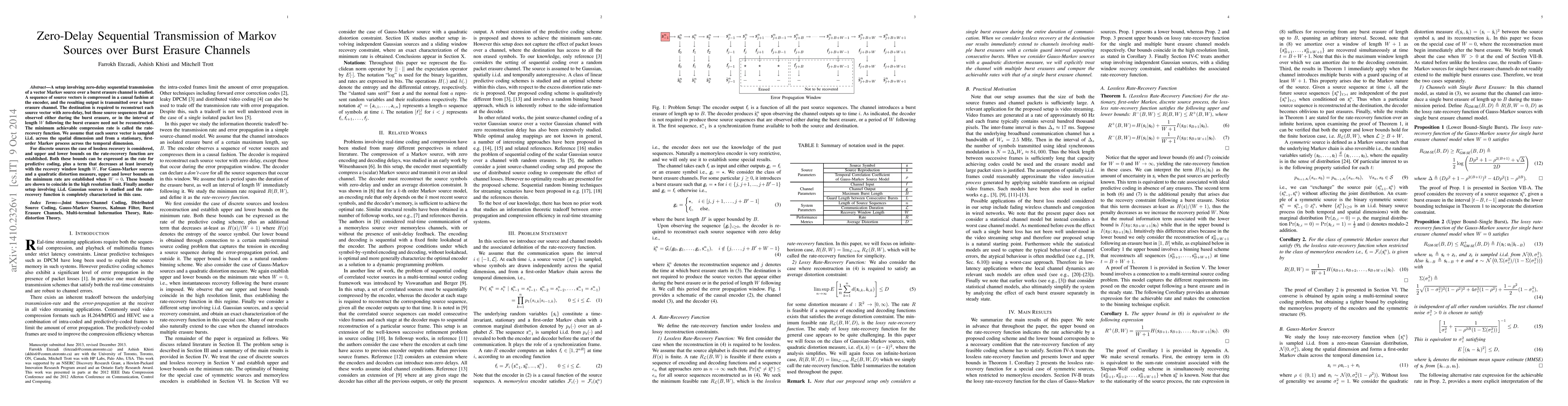 This paper investigates zero-delay sequential transmission of vector Markov sources over burst erasure channels, establishing upper and lower bounds for the rate-recovery function. For discrete sources, bounds are derived for lossless recovery, while for Gauss-Markov sources, the minimum rate is characterized under specific conditions.