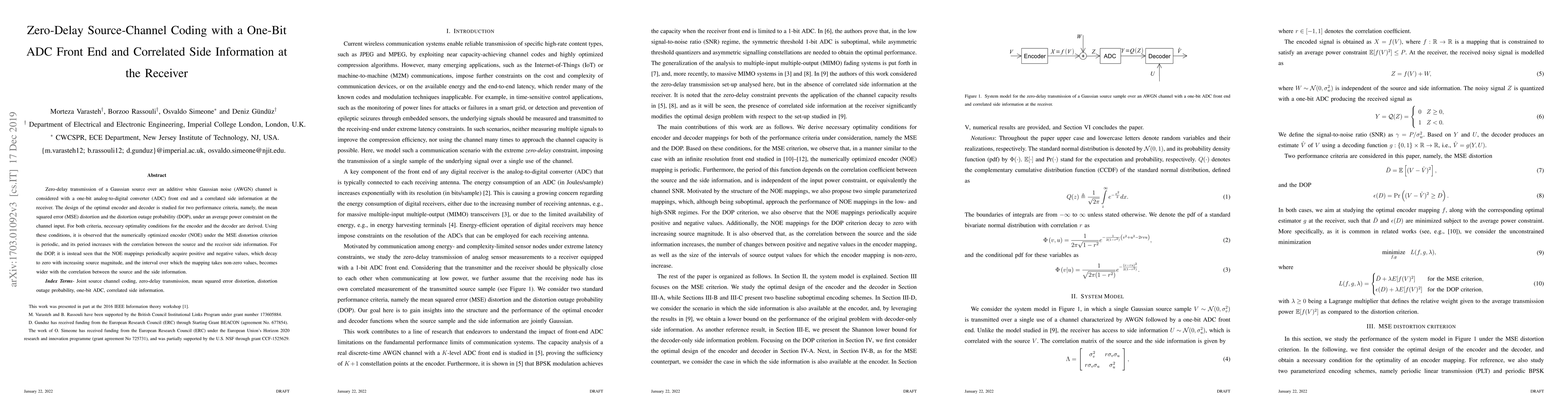 This paper investigates zero-delay source-channel coding for Gaussian sources over AWGN channels with a one-bit ADC and correlated side information at the receiver. It derives optimal encoder and decoder designs for minimizing mean squared error and distortion outage probability, revealing periodic structures in the numerically optimized encoder.