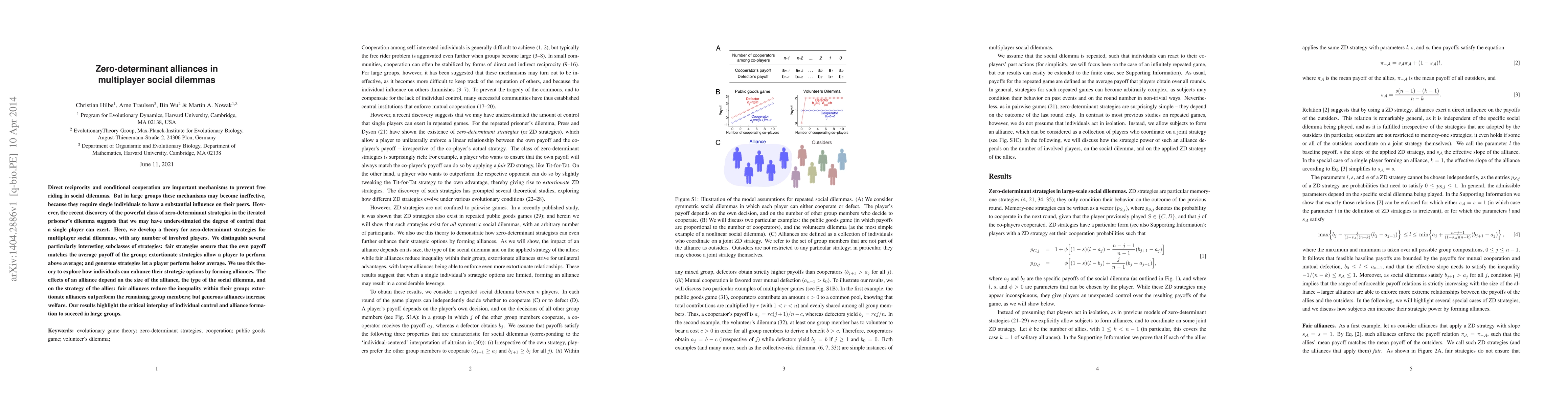 This paper develops a theory for zero-determinant strategies in multiplayer social dilemmas, exploring how individuals can enhance their payoffs through alliances. The study identifies fair, extortionate, and generous strategies, revealing that fair alliances reduce inequality, extortionate alliances outperform others, and generous alliances boost overall welfare.