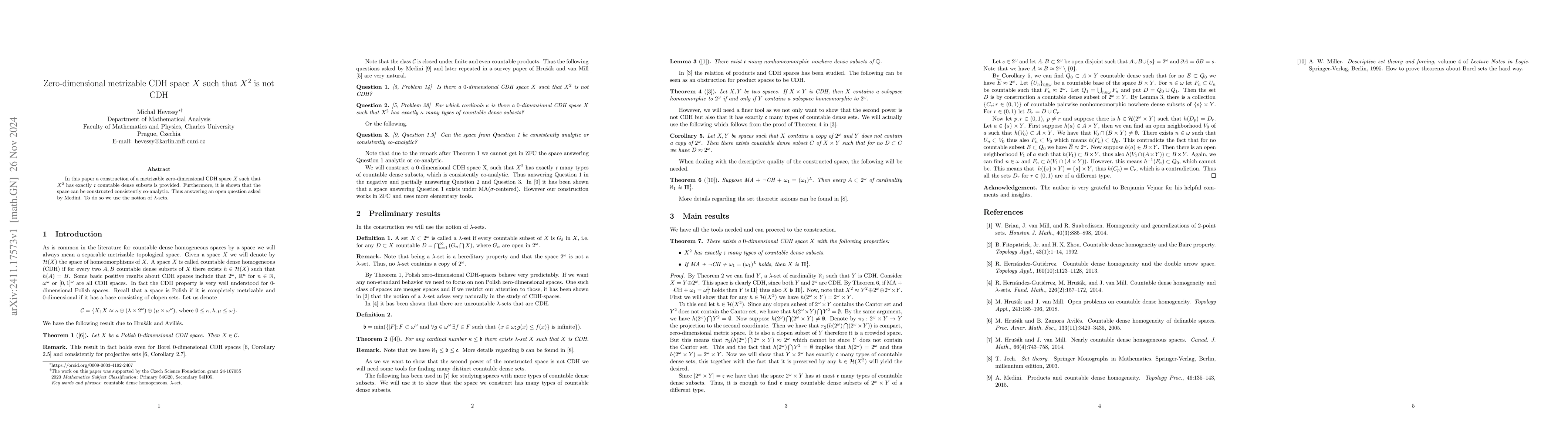 This paper constructs a metrizable zero-dimensional CDH space $X$ where $X^2$ possesses exactly $\mathfrak{c}$ countable dense subsets, addressing an open question regarding its co-analytic construction using $\lambda$-sets.