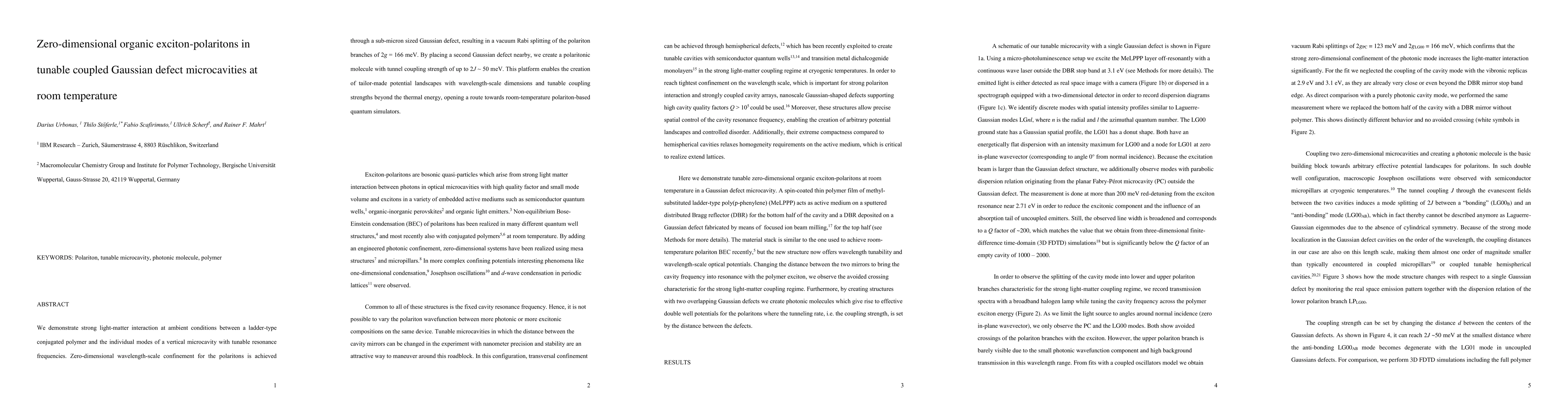 This paper demonstrates strong light-matter interaction at room temperature between a conjugated polymer and a tunable microcavity, achieving zero-dimensional exciton-polaritons with a vacuum Rabi splitting of 166 meV. The study also creates polaritonic molecules with tunable coupling strengths, paving the way for polariton-based quantum simulators.