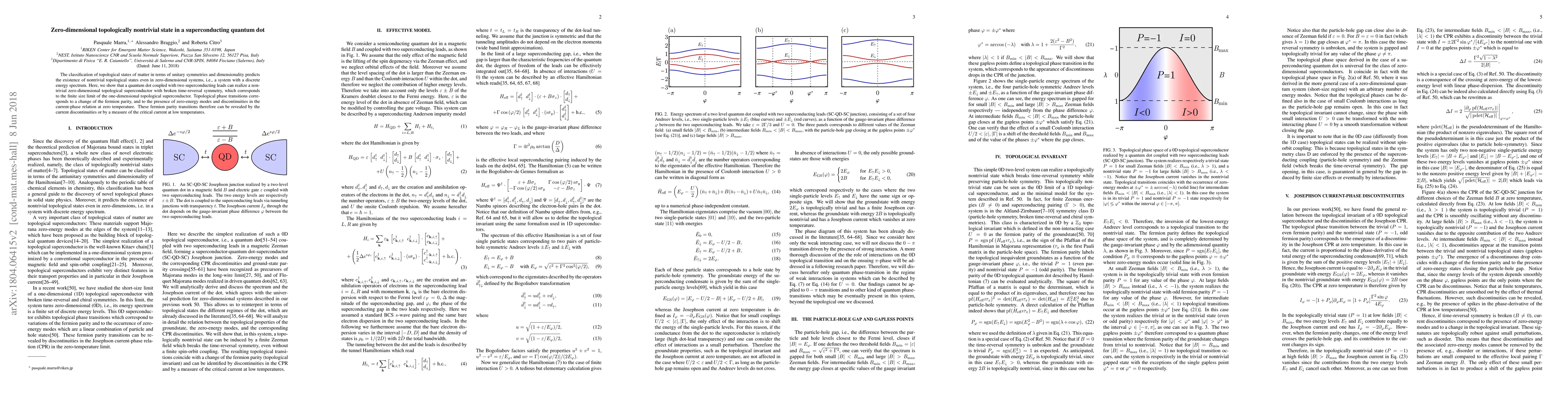 The classification of topological states of matter in terms of unitary symmetries and dimensionality predicts the existence of nontrivial topological states even in zero-dimensional systems, i.e., a system with a discrete energy spectrum. Here, we show that a quantum dot coupled with two superconducting leads can realize a nontrivial zero-dimensional topological superconductor with broken time-reversal symmetry, which corresponds to the finite size limit of the one-dimensional topological superconductor. Topological phase transitions corresponds to a change of the fermion parity, and to the presence of zero-energy modes and discontinuities in the current-phase relation at zero temperature. These fermion parity transitions therefore can be revealed by the current discontinuities or by a measure of the critical current at low temperatures.