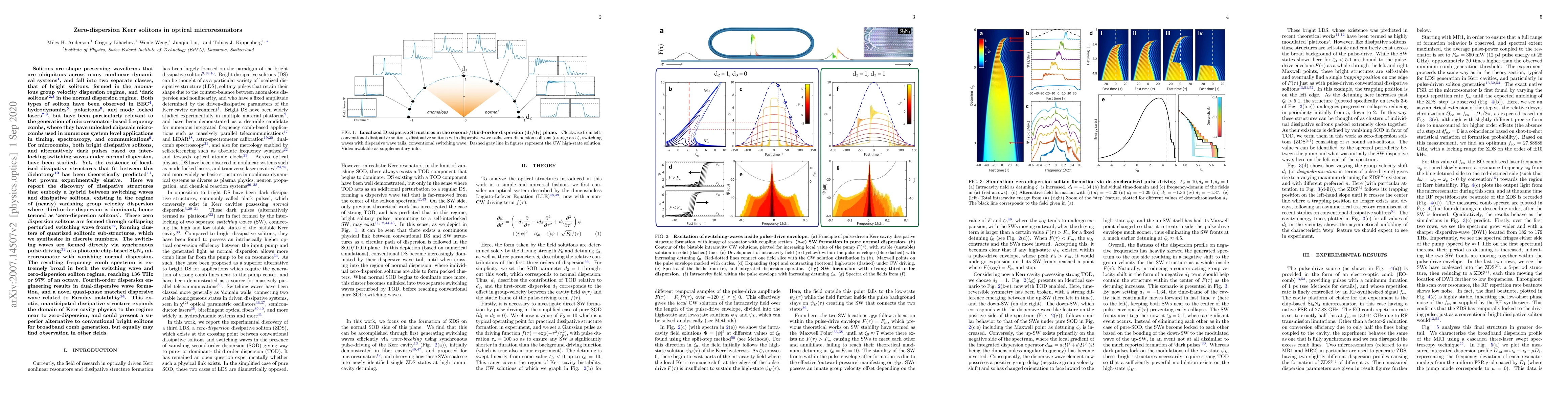Solitons are shape preserving waveforms that are ubiquitous across nonlinear dynamical systems and fall into two separate classes, that of bright solitons, formed in the anomalous group velocity dispersion regime, and `dark solitons' in the normal dispersion regime. Both types of soliton have been observed in BEC, hydrodynamics, polaritons, and mode locked lasers, but have been particularly relevant to the generation of chipscale microresonator-based frequency combs (microcombs), used in numerous system level applications in timing, spectroscopy, and communications. For microcombs, both bright solitons, and alternatively dark pulses based on interlocking switching waves, have been studied. Yet, the existence of localized dissipative structures that fit between this dichotomy has been theoretically predicted, but proven experimentally elusive. Here we report the discovery of dissipative structures that embody a hybrid between switching waves and dissipative solitons, existing in the regime of (nearly) vanishing group velocity dispersion where third-order dispersion is dominant, hence termed as `zero-dispersion solitons'. These dissipative structures are formed via collapsing switching wave fronts, forming clusters of quantized solitonic sub-structures. The switching waves are formed directly via synchronous pulse-driving of a photonic chip-based Si3N4 microresonator. The resulting frequency comb spectrum is extremely broad in both the switching wave and zero-dispersion soliton regime, reaching 136 THz or 97% of an octave. Fourth-order dispersion engineering results in dual-dispersive wave formation, and a novel quasi-phase matched wave related to Faraday instability. This exotic unanticipated dissipative structure expands the domain of Kerr cavity physics to the regime near zero-dispersion and could present a superior alternative to conventional solitons for broadband comb generation.
