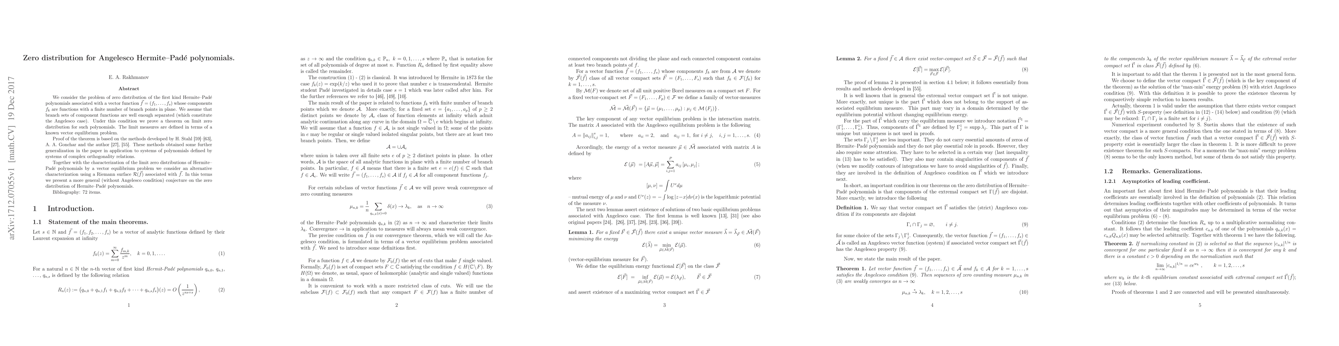 We consider the problem of zero distribution of the first kind Hermite--Pad\'e polynomials associated with a vector function $\vec f = (f_1, \dots, f_s)$ whose components $f_k$ are functions with a finite number of branch points in plane. We assume that branch sets of component functions are well enough separated (which constitute the Angelesco case). Under this condition we prove a theorem on limit zero distribution for such polynomials. The limit measures are defined in terms of a known vector equilibrium problem. Proof of the theorem is based on the methods developed by H.~Stahl, A.~A.~Gonchar and the author. These methods obtained some further generalization in the paper in application to systems of polynomials defined by systems of complex orthogonality relations. Together with the characterization of the limit zero distributions of Hermite--Pad\'e polynomials by a vector equilibrium problem we consider an alternative characterization using a Riemann surface $\mathcal R(\vec f)$ associated with $\vec f$. In this terms we present a more general (without Angelesco condition) conjecture on the zero distribution of Hermite--Pad\'e polynomials. Bibliography: 72 items.