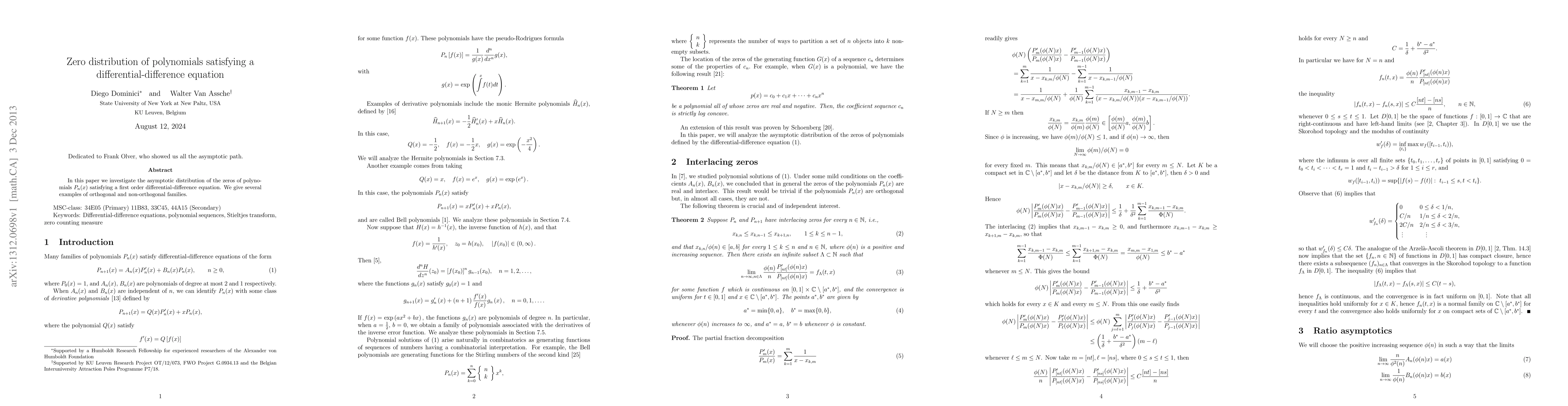 This paper examines the asymptotic distribution of zeros for polynomials $P_{n}(x)$ that satisfy a first-order differential-difference equation, providing examples of both orthogonal and non-orthogonal families.