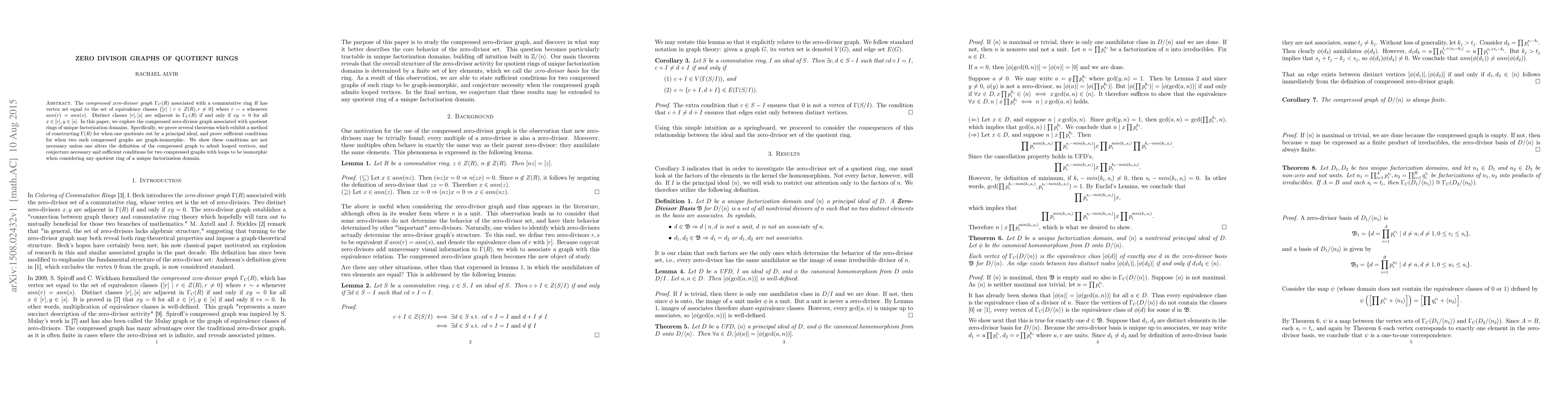 The compressed zero-divisor graph $\Gamma_C(R)$ associated with a commutative ring $R$ has vertex set equal to the set of equivalence classes $\{ [r] \mid r \in Z(R), r \neq 0 \}$ where $r \sim s$ whenever $ann(r) = ann(s)$. Distinct classes $[r],[s]$ are adjacent in $\Gamma_C(R)$ if and only if $xy = 0$ for all $x \in [r], y \in [s]$. In this paper, we explore the compressed zero-divisor graph associated with quotient rings of unique factorization domains. Specifically, we prove several theorems which exhibit a method of constructing $\Gamma(R)$ for when one quotients out by a principal ideal, and prove sufficient conditions for when two such compressed graphs are graph-isomorphic. We show these conditions are not necessary unless one alters the definition of the compressed graph to admit looped vertices, and conjecture necessary and sufficient conditions for two compressed graphs with loops to be isomorphic when considering any quotient ring of a unique factorization domain.