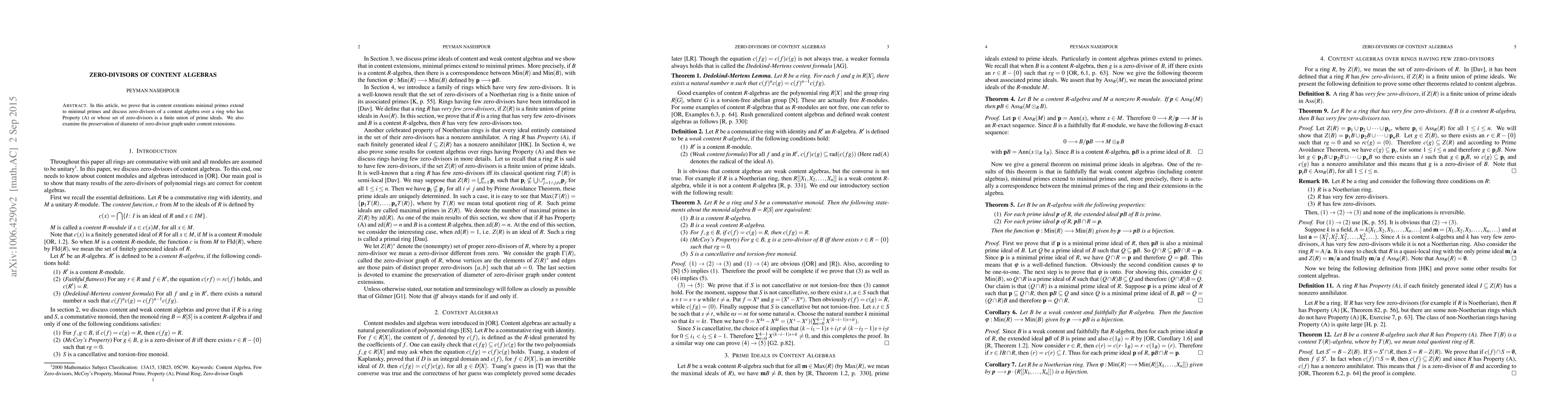 This paper proves that minimal primes in content extensions extend to minimal primes and explores zero-divisors in content algebras over rings with Property (A) or finite unions of prime zero-divisors. It also investigates the preservation of the diameter of zero-divisor graphs under content extensions.