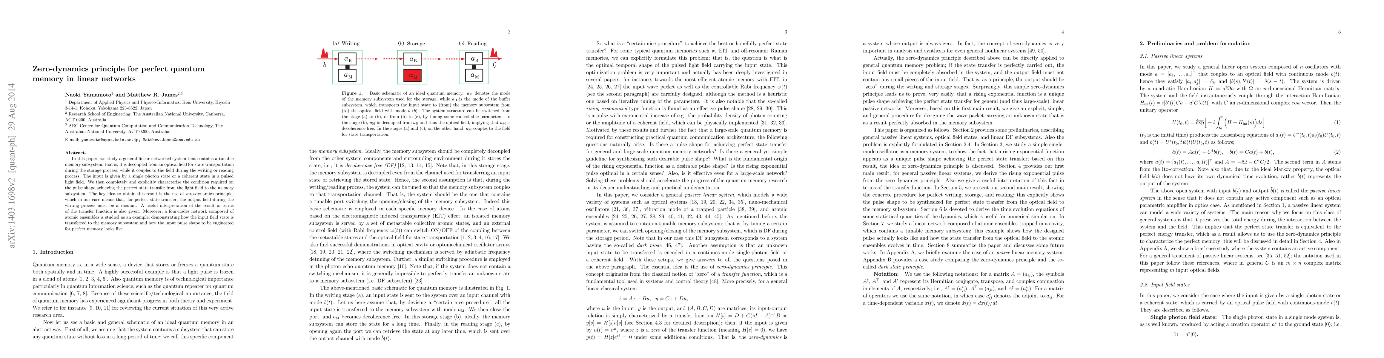 This paper explores a linear networked quantum system with a tunable memory subsystem, focusing on perfect state transfer using the zero-dynamics principle. It characterizes the required pulse shape for optimal state transfer, ensuring the output field remains a vacuum during the writing process, and provides a practical example using a four-node network of atomic ensembles.