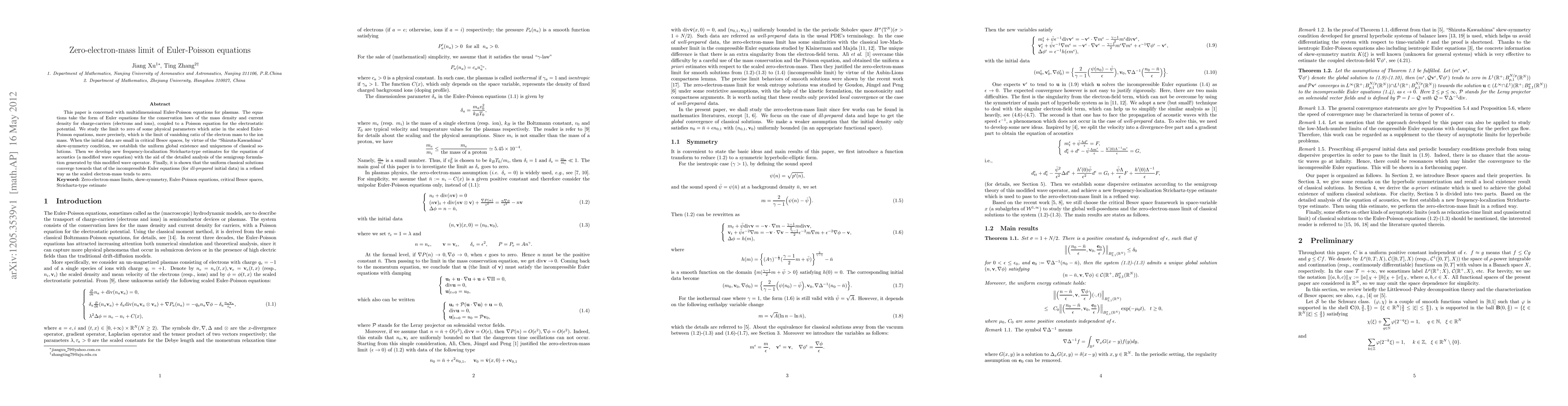 This paper investigates the multidimensional Euler-Poisson equations for plasmas, focusing on the zero-electron-mass limit. It establishes uniform global existence and uniqueness of classical solutions under small initial data conditions, and shows convergence to the incompressible Euler equations as the electron mass approaches zero.
