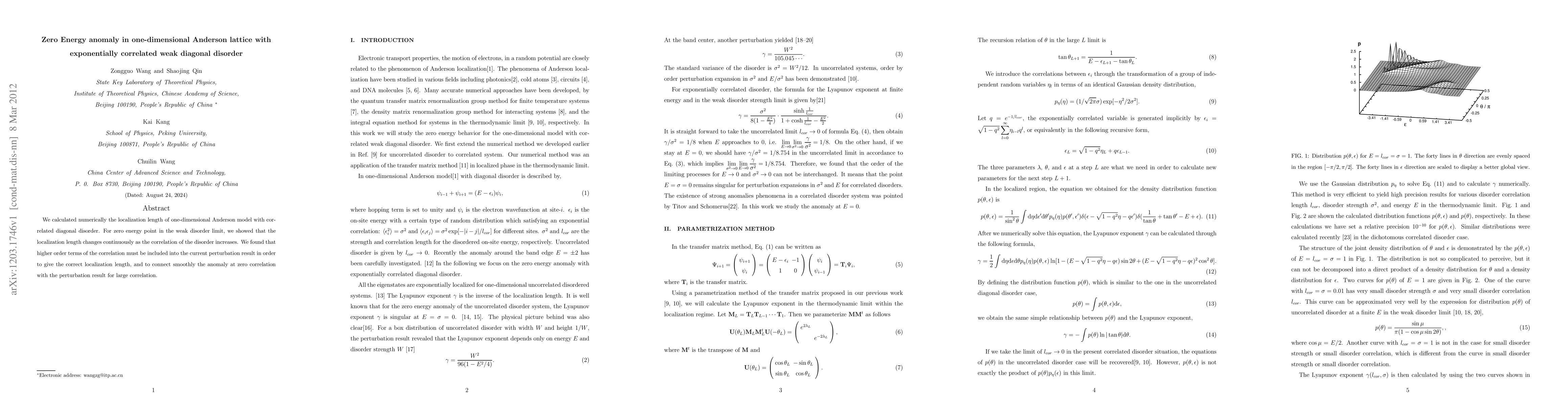 Summary: This study numerically investigates the localization length in a one-dimensional Anderson model with exponentially correlated weak diagonal disorder. It reveals a continuous change in localization length at zero energy as disorder correlation increases, necessitating higher-order correlation terms for accurate results.