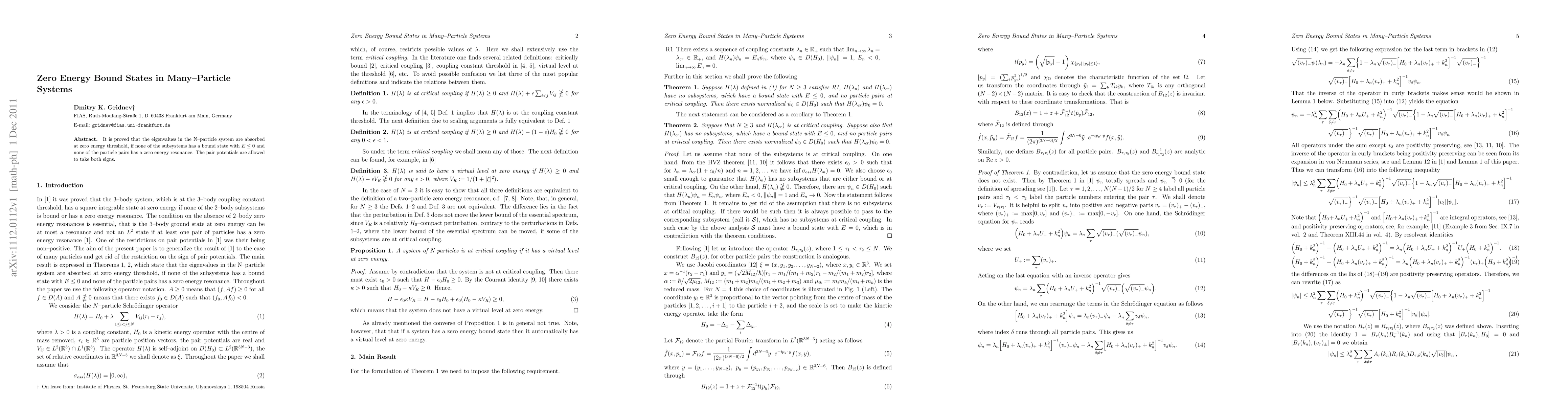 Summary: The research demonstrates that N-particle systems will not have eigenvalues below zero energy if no subsystems or particle pairs possess bound states or zero energy resonances, regardless of the potentials' signs. This establishes a zero energy threshold for such systems.