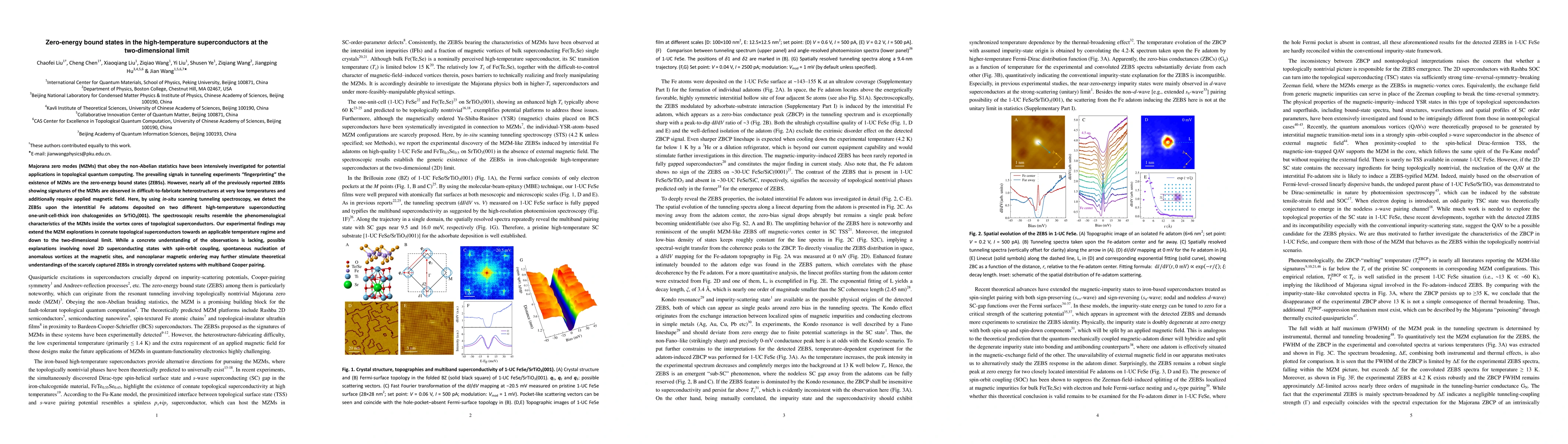 Majorana zero modes (MZMs) that obey the non-Abelian statistics have been intensively investigated for potential applications in topological quantum computing. The prevailing signals in tunneling experiments "fingerprinting" the existence of MZMs are the zero-energy bound states (ZEBSs). However, nearly all of the previously reported ZEBSs showing signatures of the MZMs are observed in difficult-to-fabricate heterostructures at very low temperatures and additionally require applied magnetic field. Here, by using in-situ scanning tunneling spectroscopy, we detect the ZEBSs upon the interstitial Fe adatoms deposited on two different high-temperature superconducting one-unit-cell-thick iron chalcogenides on SrTiO3(001). The spectroscopic results resemble the phenomenological characteristics of the MZMs inside the vortex cores of topological superconductors. Our experimental findings may extend the MZM explorations in connate topological superconductors towards an applicable temperature regime and down to the two-dimensional limit. While a concrete understanding of the observations is lacking, possible explanations involving novel 2D superconducting states with spin-orbit coupling, spontaneous nucleation of anomalous vortices at the magnetic sites, and noncoplanar magnetic ordering may further stimulate theoretical understandings of the scarcely captured ZEBSs in strongly correlated systems with multiband Cooper pairing.