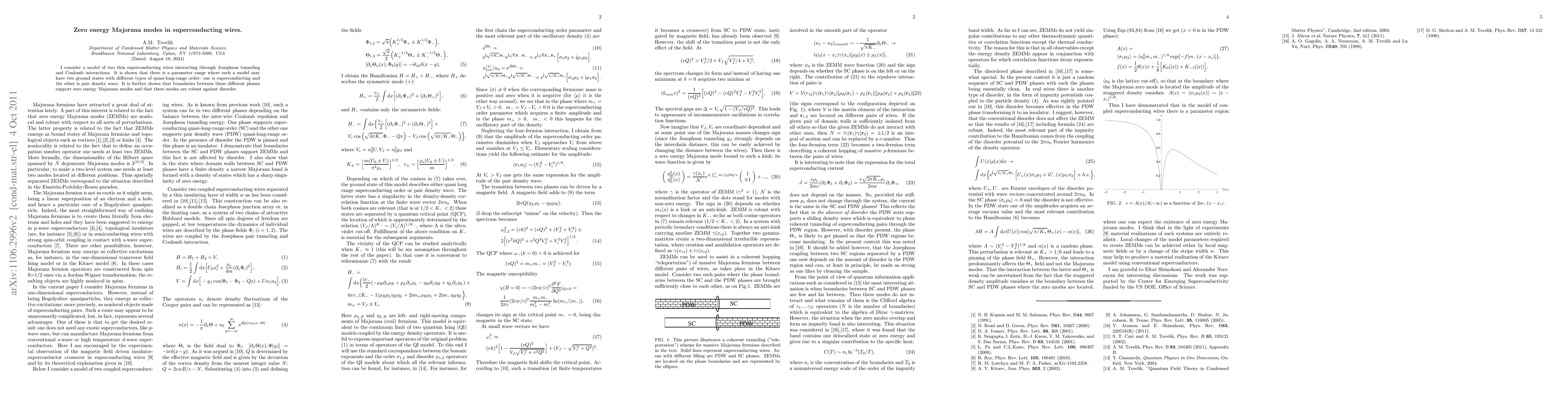 I consider a model of two thin superconducting wires interacting through Josephson tunneling and Coulomb interactions. It is shown that there is a parameter range where such a model may have two ground states with different types of quasi-long-range order: one is superconducting and the other is pair density wave. It is further shown that boundaries between these different phases support zero energy Majorana modes and that these modes are robust against disorder.