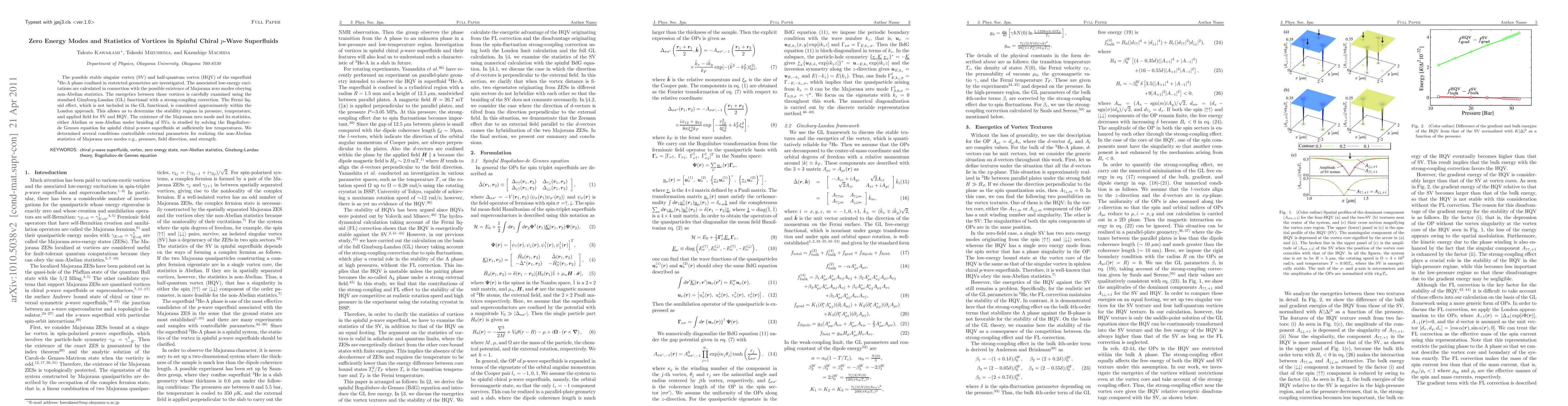 This paper investigates the vortex structures and low-energy excitations in spinful chiral p-wave superfluids, focusing on the stability and statistics of Majorana zero modes in confined geometries. The study employs Ginzburg-Landau theory with corrections and London approach to determine stability regions and conditions for non-Abelian statistics.