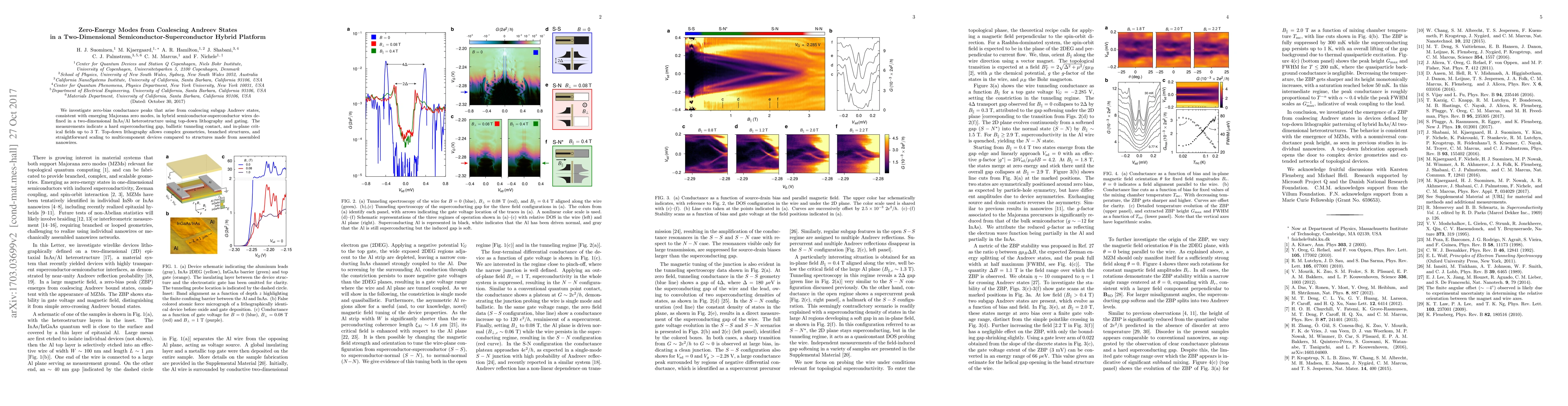 The research investigates zero-bias conductance peaks (ZBPs) from coalescing subgap Andreev states in hybrid semiconductor-superconductor wires using top-down lithography and gating in a 2D InAs/Al heterostructure.