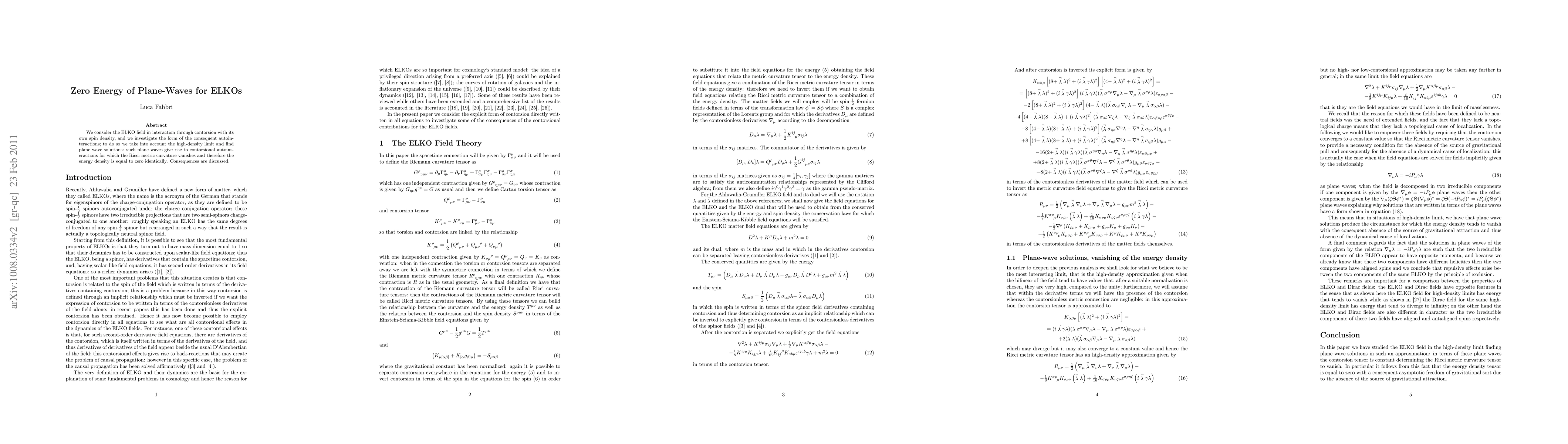 We consider the ELKO field in interaction through contorsion with its own spin density, and we investigate the form of the consequent autointeractions; to do so we take into account the high-density limit and find plane wave solutions: such plane waves give rise to contorsional autointeractions for which the Ricci metric curvature vanishes and therefore the energy density is equal to zero identically. Consequences are discussed.