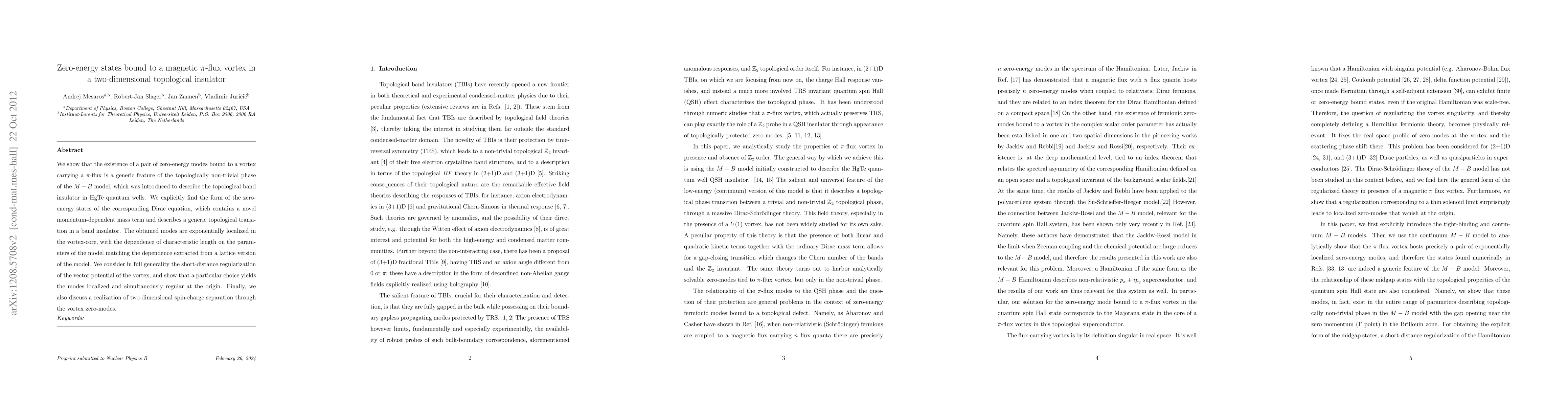 We show that the existence of a pair of zero-energy modes bound to a vortex carrying a pi-flux is a generic feature of the topologically non-trivial phase of the M-B model, which was introduced to describe the topological band insulator in HgTe quantum wells. We explicitly find the form of the zero-energy states of the corresponding Dirac equation, which contains a novel momentum-dependent mass term and describes a generic topological transition in a band insulator. The obtained modes are exponentially localized in the vortex-core, with the dependence of characteristic length on the parameters of the model matching the dependence extracted from a lattice version of the model. We consider in full generality the short-distance regularization of the vector potential of the vortex, and show that a particular choice yields the modes localized and simultaneously regular at the origin. Finally, we also discuss a realization of two-dimensional spin-charge separation through the vortex zero-modes.