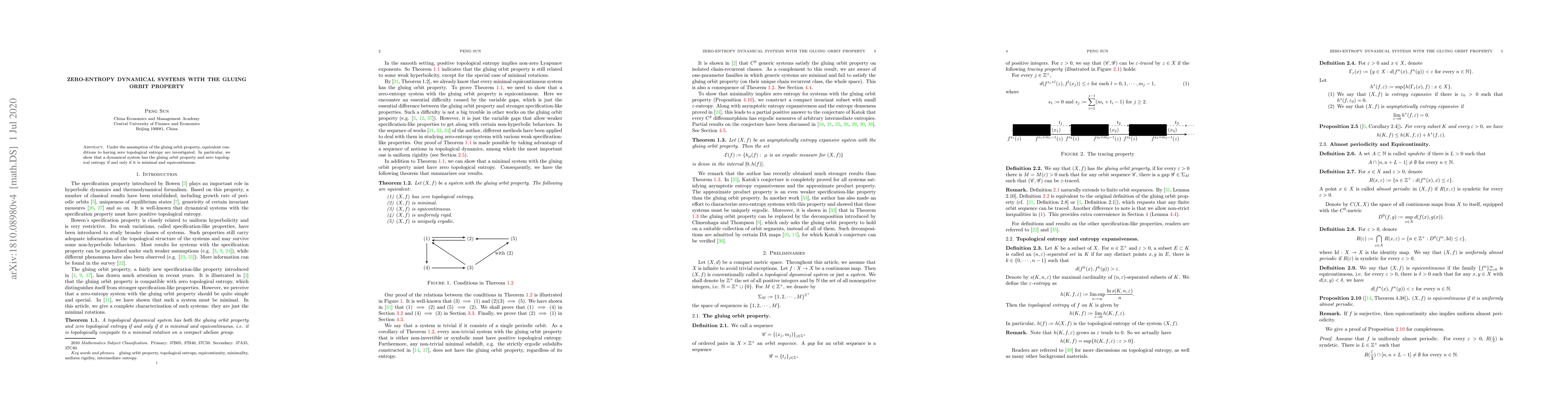 This paper investigates dynamical systems with zero topological entropy under the gluing orbit property, demonstrating that such systems are minimal and equicontinuous. The study concludes that these systems exhibit both the gluing orbit property and zero entropy if and only if they meet these criteria.