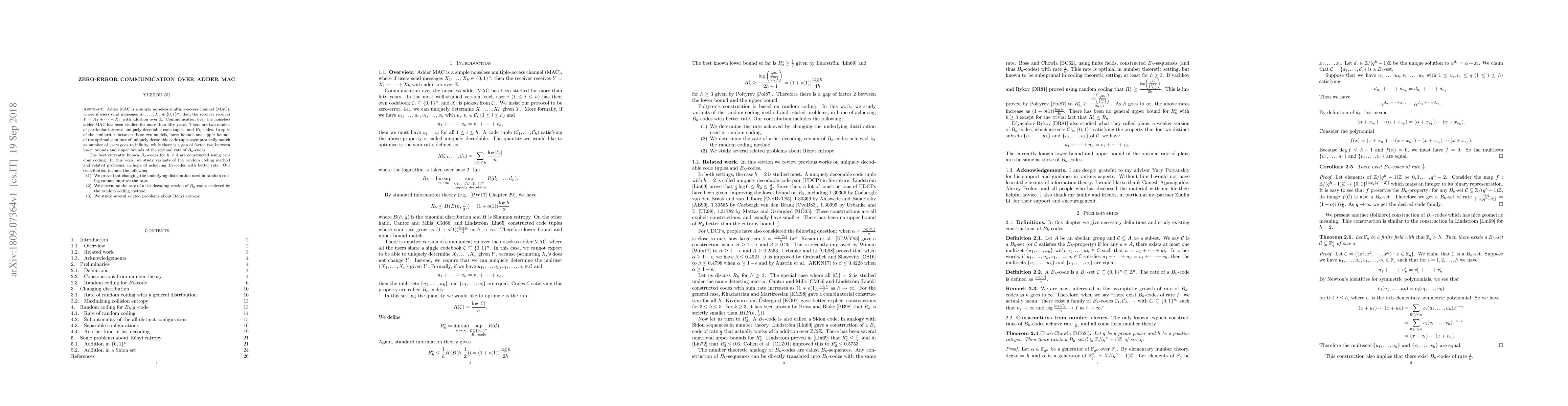 Adder MAC is a simple noiseless multiple-access channel (MAC), where if users send messages $X_1,\ldots,X_h\in \{0,1\}^n$, then the receiver receives $Y = X_1+\cdots+X_h$ with addition over $\mathbb{Z}$. Communication over the noiseless adder MAC has been studied for more than fifty years. There are two models of particular interest: uniquely decodable code tuples, and $B_h$-codes. In spite of the similarities between these two models, lower bounds and upper bounds of the optimal sum rate of uniquely decodable code tuple asymptotically match as number of users goes to infinity, while there is a gap of factor two between lower bounds and upper bounds of the optimal rate of $B_h$-codes. The best currently known $B_h$-codes for $h\ge 3$ are constructed using random coding. In this work, we study variants of the random coding method and related problems, in hope of achieving $B_h$-codes with better rate. Our contribution include the following. (1) We prove that changing the underlying distribution used in random coding cannot improve the rate. (2) We determine the rate of a list-decoding version of $B_h$-codes achieved by the random coding method. (3) We study several related problems about R\'{e}nyi entropy.