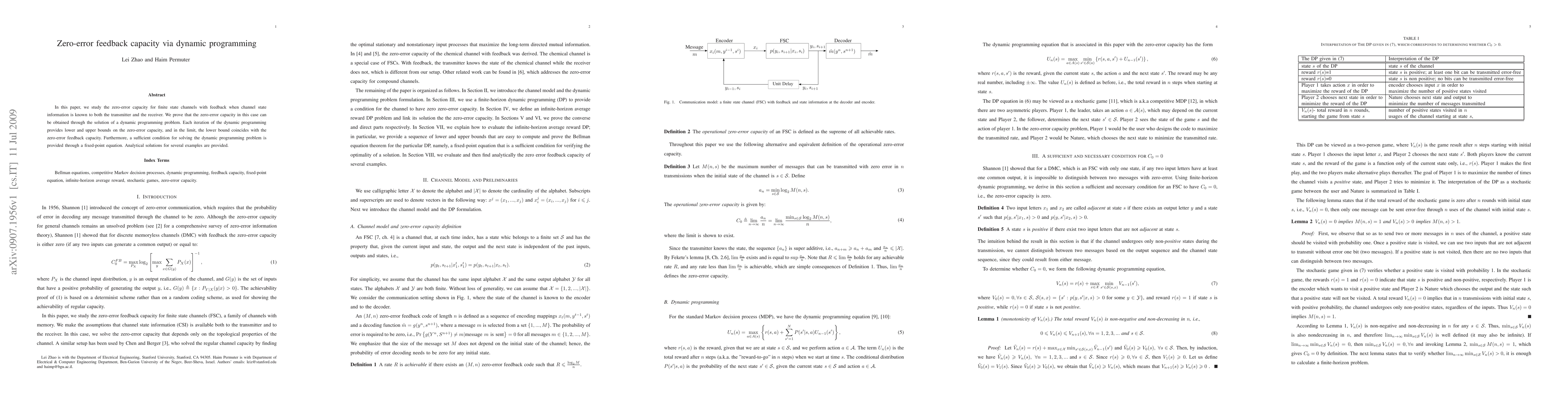 This paper explores the zero-error capacity for finite state channels with feedback, demonstrating that it can be determined via dynamic programming. The method iteratively refines bounds on the capacity, converging to the zero-error feedback capacity, with a fixed-point equation offering a sufficient condition for solving the problem.