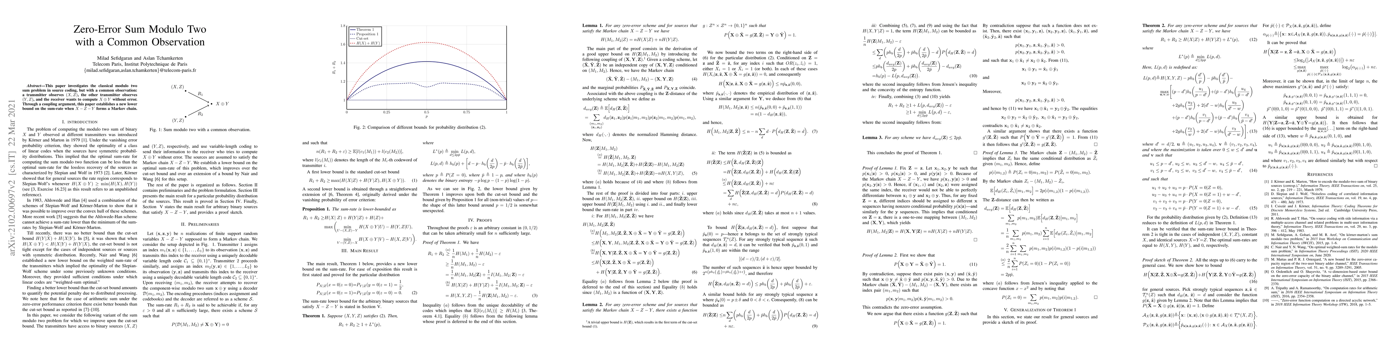 This paper investigates the classical modulo two sum problem in source coding, but with a common observation: a transmitter observes $(X,Z)$, the other transmitter observes $(Y,Z)$, and the receiver wants to compute $X \oplus Y$ without error. Through a coupling argument, this paper establishes a new lower bound on the sum-rate when $X-Z-Y$ forms a Markov chain.