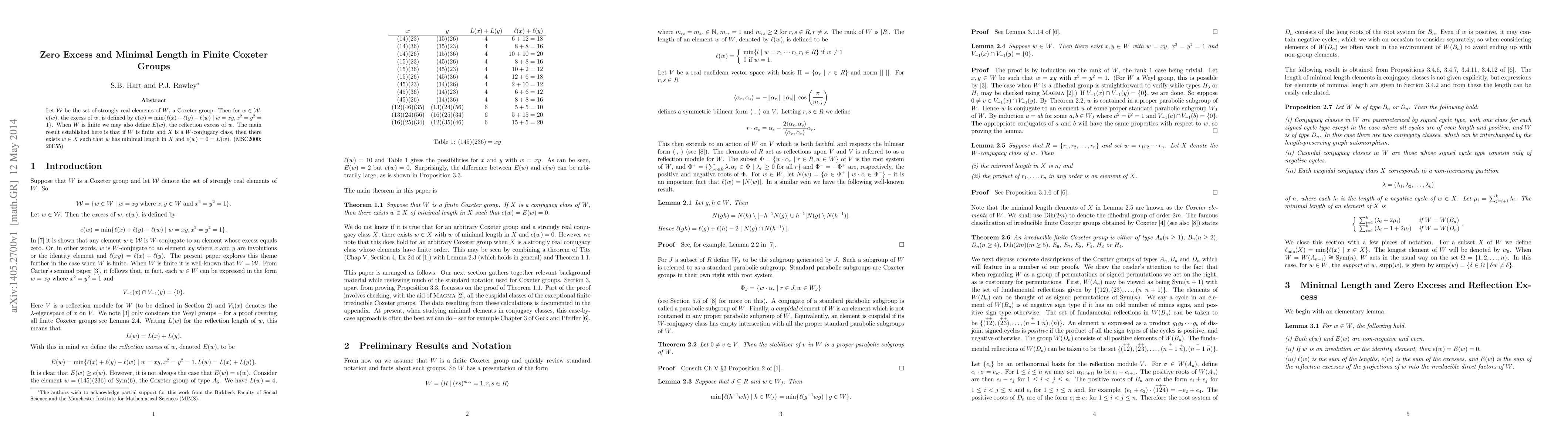 Let $\mathcal{W}$ be the set of strongly real elements of $W$, a Coxeter group. Then for $w \in \mathcal{W}$, $e(w)$, the excess of $w$, is defined by $e(w) = \min\{\ell(x) + \ell(y) - \ell(w) \; | \; w=xy, x^2 = y^2 = 1\}$. When $W$ is finite we may also define $E(w)$, the reflection excess of $w$. The main result established here is that if $W$ is finite and $X$ is a $W$-conjugacy class, then there exists $w \in X$ such that $w$ has minimal length in $X$ and $e(w) = 0 = E(w)$.
