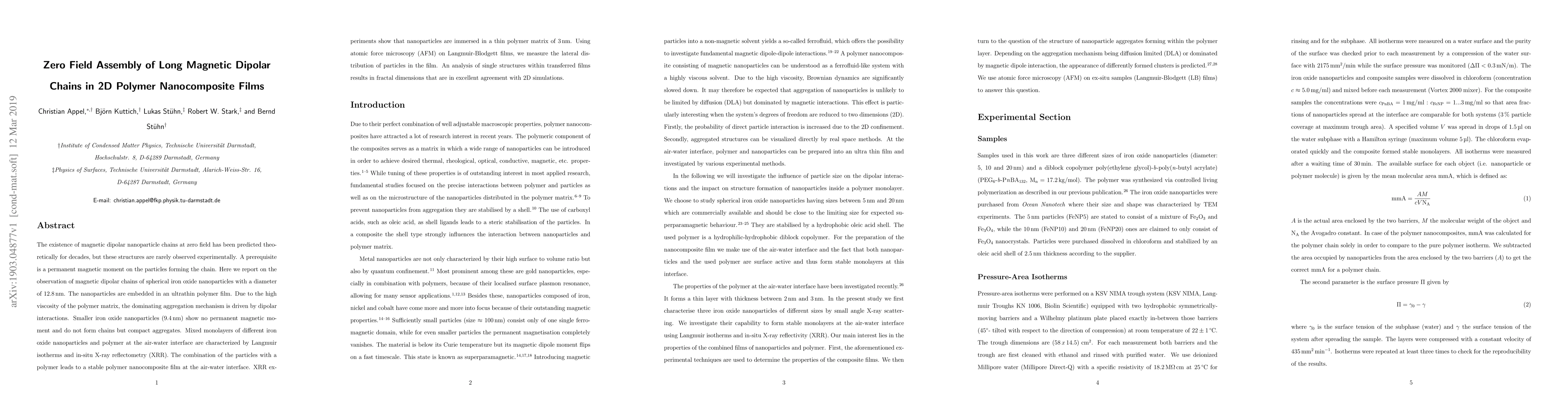 The paper presents a detailed characterization of magnetic dipolar chain formation in 2D polymer nanocomposite films, combining SAXS, Langmuir isotherms, and in-situ XRR measurements with AFM analysis.