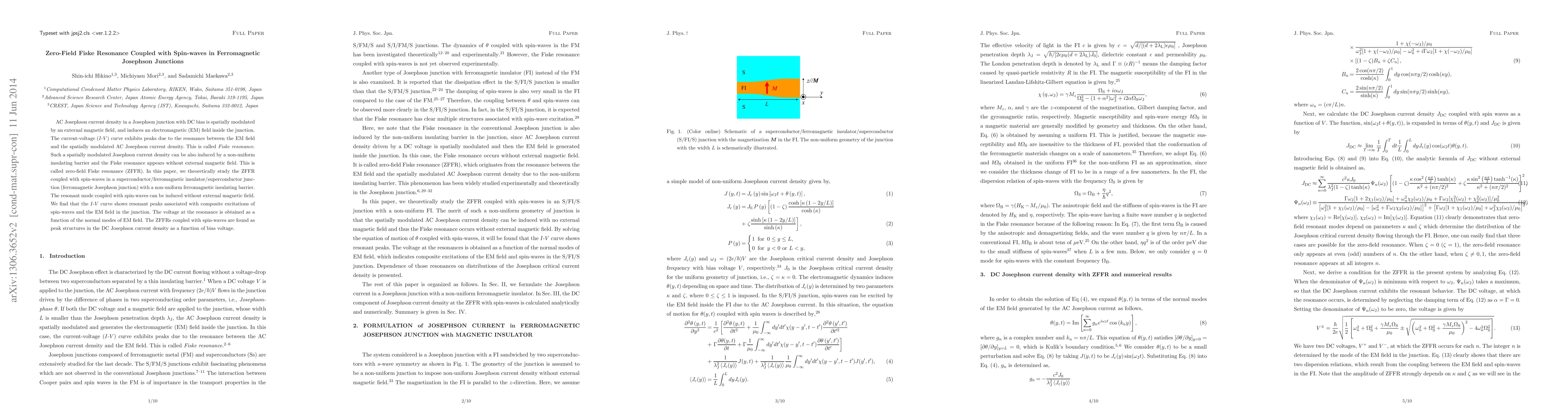 AC Josephson current density in a Josephson junction with DC bias is spatially modulated by an external magnetic field, and induces an electromagnetic (EM) field inside the junction. The current-voltage ($I$-$V$) curve exhibits peaks due to the resonance between the EM field and the spatially modulated AC Josephson current density. This is called {\it Fiske resonance}. Such a spatially modulated Josephson current density can be also induced by a non-uniform insulating barrier and the Fiske resonance appears without external magnetic field. This is called zero-field Fiske resonance (ZFFR). In this paper, we theoretically study the ZFFR coupled with spin-waves in a superconductor/ferromagnetic insulator/superconductor junction (ferromagnetic Josephson junction) with a non-uniform ferromagnetic insulating barrier. The resonant mode coupled with spin-waves can be induced without external magnetic field. We find that the $I$-$V$ curve shows resonant peaks associated with composite excitations of spin-waves and the EM field in the junction. The voltage at the resonance is obtained as a function of the normal modes of EM field. The ZFFRs coupled with spin-waves are found as peak structures in the DC Josephson current density as a function of bias voltage.