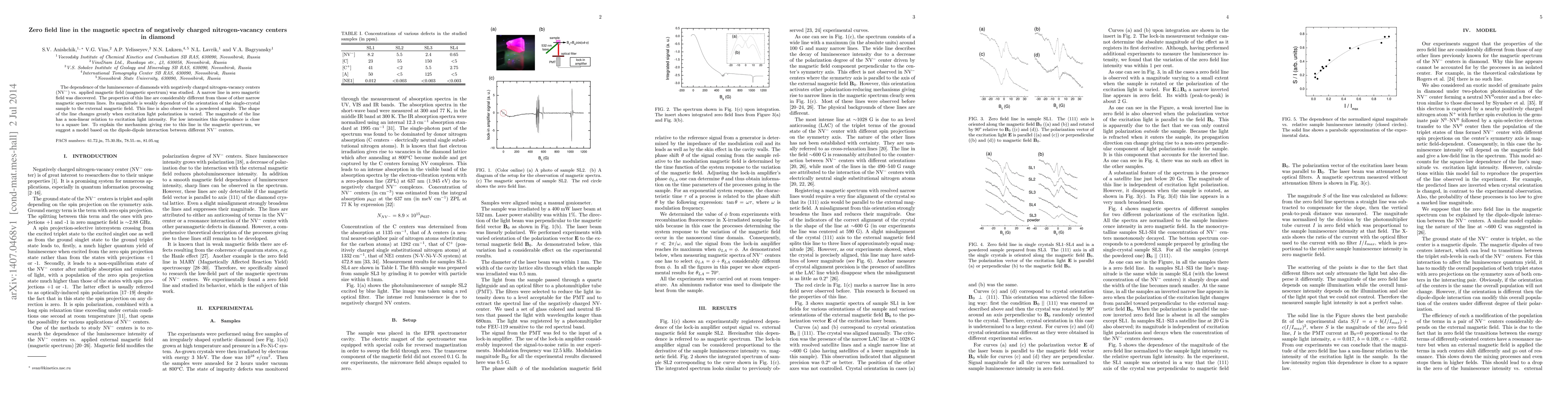 The dependence of the luminescence of diamonds with negatively charged nitrogen-vacancy centers (NV-) vs. applied magnetic field (magnetic spectrum) was studied. A narrow line in zero magnetic field was discovered. The properties of this line are considerably different from those of other narrow magnetic spectrum lines. Its magnitude is weakly dependent of the orientation of the single-crystal sample to the external magnetic field. This line is also observed in a powdered sample. The shape of the line changes greatly when excitation light polarization is varied. The magnitude of the line has a non-linear relation to excitation light intensity. For low intensities this dependence is close to a square law. To explain the mechanism giving rise to this line in the magnetic spectrum, we suggest a model based on the dipole-dipole interaction between different NV- centers.