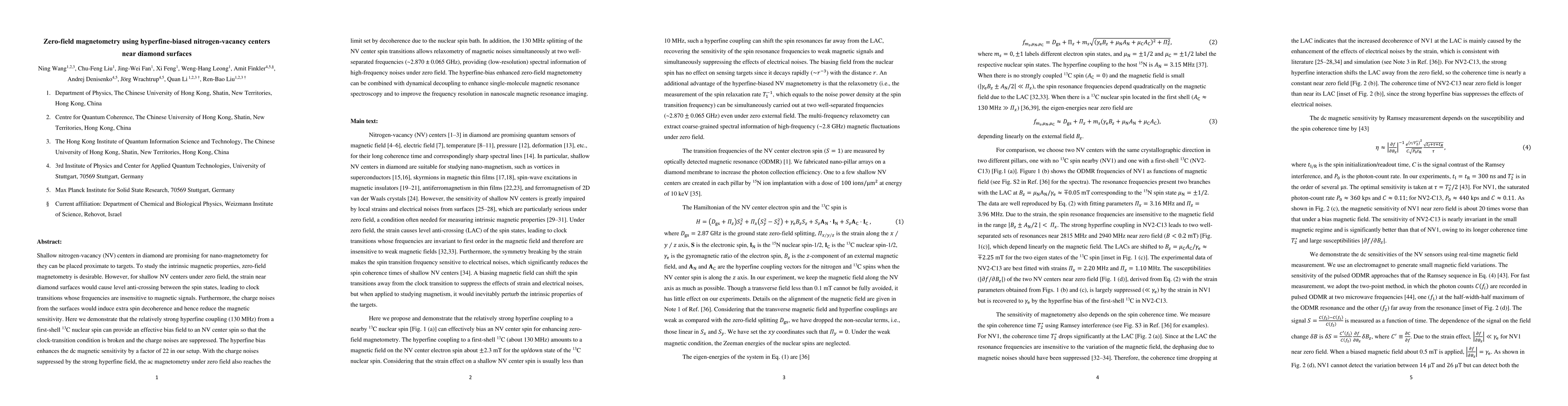 This paper demonstrates a method to enhance zero-field magnetometry using hyperfine-biased nitrogen-vacancy (NV) centers in diamond, overcoming issues of strain-induced anti-crossing and charge noise. The strong hyperfine coupling from a 13C nuclear spin provides an effective bias field, improving dc magnetic sensitivity by a factor of 22 and enabling ac magnetometry under zero field, while also allowing simultaneous relaxometry of magnetic noises at two frequencies.