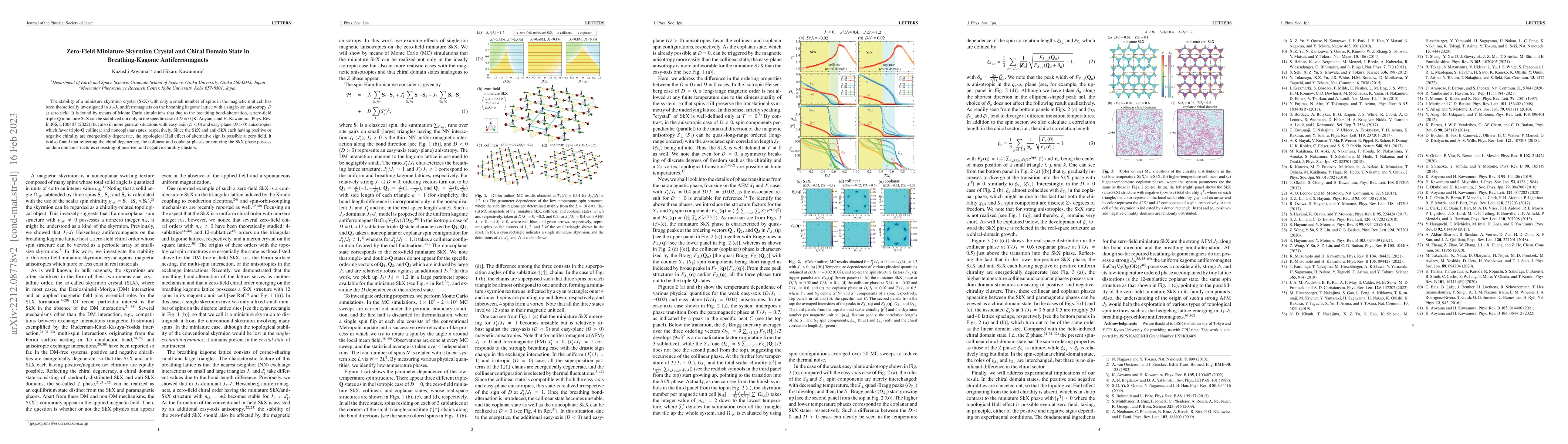 This paper investigates the stability of a zero-field miniature skyrmion crystal in $J_1$-$J_3$ antiferromagnets on the breathing kagome lattice. Monte Carlo simulations reveal that a triple-${\bf Q}$ miniature SkX can be stabilized across various single-ion anisotropy conditions, leading to potential topological Hall effects and chiral domain states.