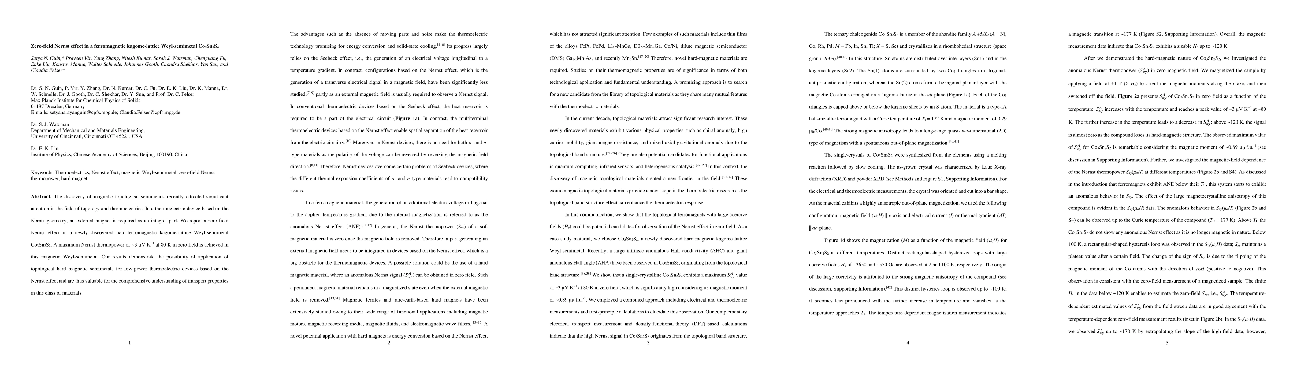 This paper reports the discovery of a zero-field Nernst effect in the ferromagnetic kagome-lattice Weyl-semimetal Co3Sn2S2, achieving a maximum Nernst thermopower of 3 microvolt/K at 80 K, indicating potential for low-power thermoelectric devices. The findings enhance understanding of transport properties in magnetic topological semimetals.