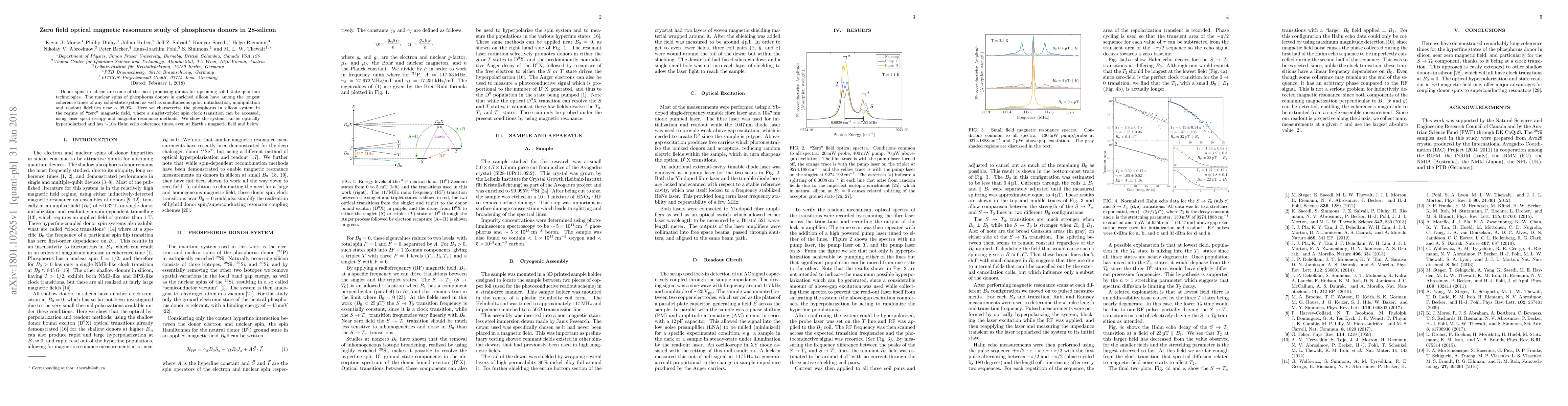 This study investigates phosphorus donors in silicon under zero magnetic field conditions using optical magnetic resonance, demonstrating long coherence times and high fidelity for qubit operations, and showing the potential for optically hyperpolarized states with ~10 s Hahn echo coherence times.