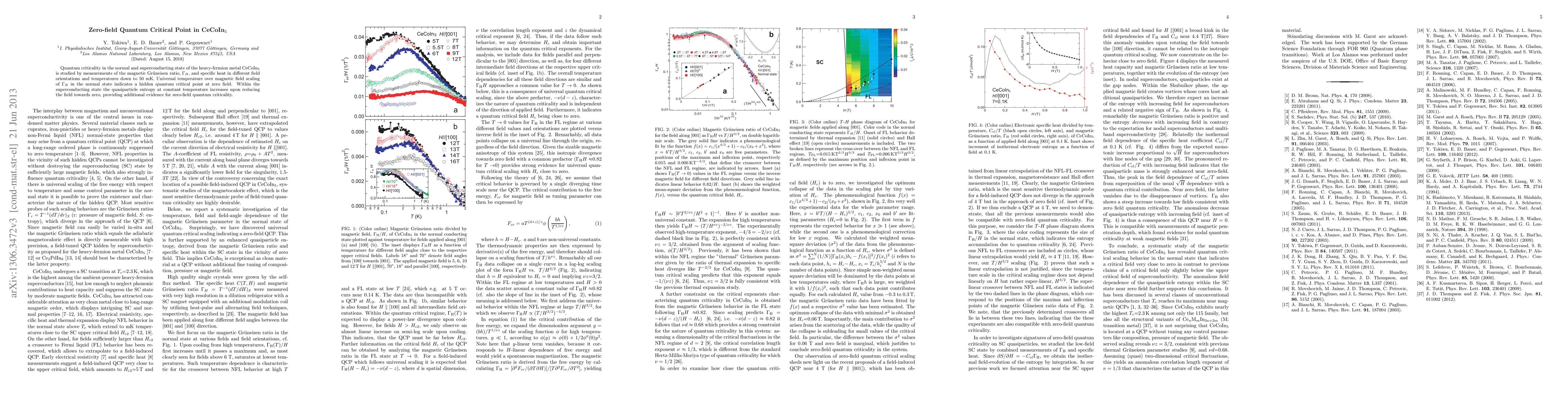 This study investigates the quantum critical behavior in CeCoIn$_5$ through measurements of the magnetic Grüneisen ratio and specific heat, revealing a hidden zero-field quantum critical point indicated by universal scaling in the normal state and increased quasiparticle entropy in the superconducting state as the magnetic field approaches zero.