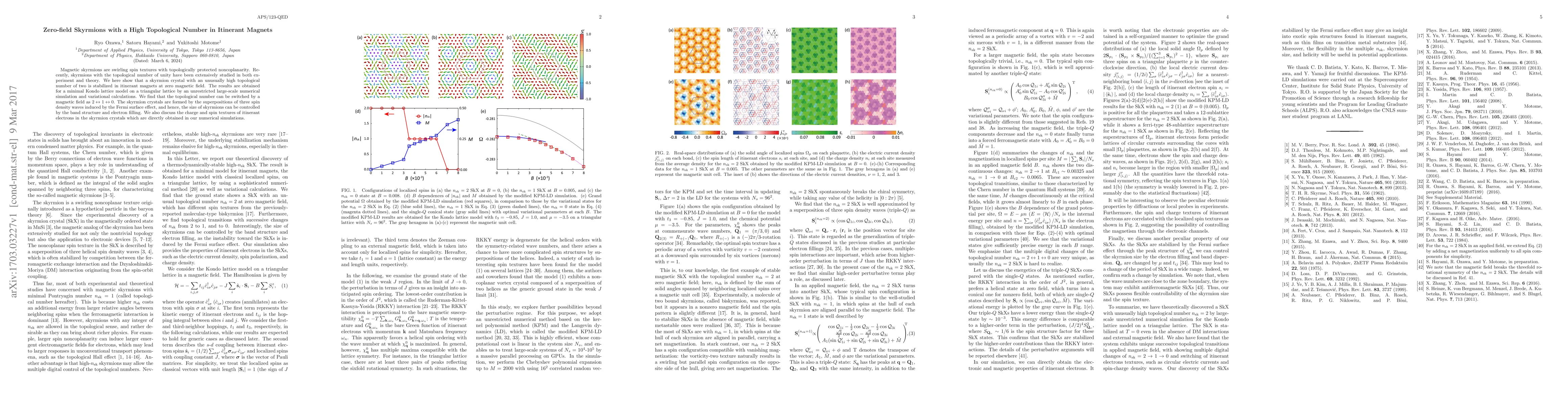 This paper reports the stabilization of a skyrmion crystal with a high topological number of two in itinerant magnets at zero magnetic field, achieved through a minimal Kondo lattice model simulation. The topological number can be switched by a magnetic field, and the skyrmion size is controlled by the band structure and electron filling.