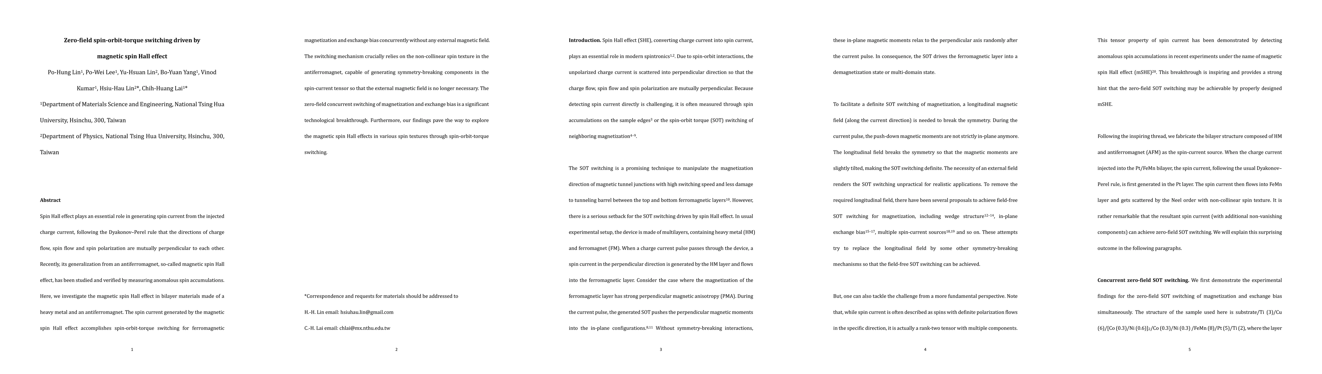 This paper investigates the magnetic spin Hall effect in bilayer materials, demonstrating zero-field spin-orbit-torque switching of ferromagnetic magnetization and exchange bias without an external magnetic field, facilitated by non-collinear spin textures in the antiferromagnet. This breakthrough enables concurrent switching and opens new avenues for spin-orbit-torque applications.
