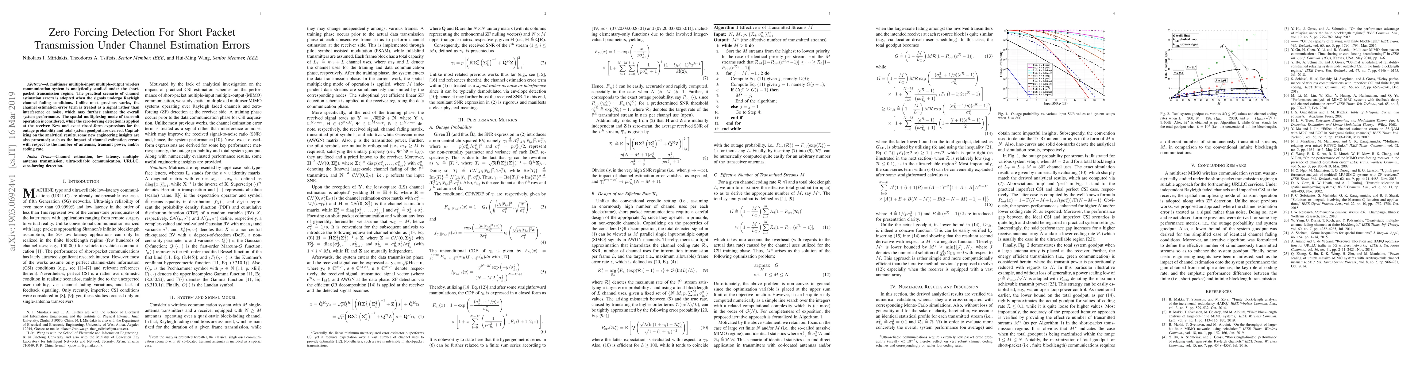 A multiuser multiple-input multiple-output wireless communication system is analytically studied under the short-packet transmission regime. The practical scenario of channel estimation errors is adopted when the signals undergo Rayleigh channel fading conditions. Unlike most previous works, the channel estimation error term is treated as a signal rather than interference or noise, which may further enhance the overall system performance. The spatial multiplexing mode of transmit operation is considered, while the zero-forcing detection is applied at the receiver. New and exact closed-form expressions for the outage probability and total system goodput are derived. Capitalizing on the analytical results, some new engineering insights are also presented; such as the impact of channel estimation errors with respect to the number of antennas, transmit power, and/or coding rate.