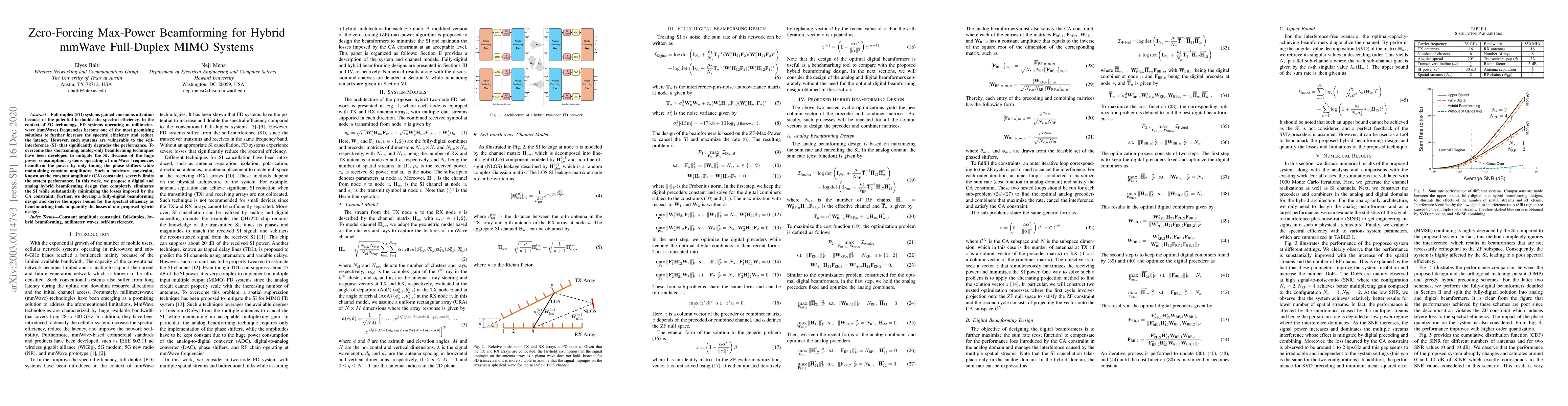 This paper proposes a hybrid digital and analog beamforming design for mmWave full-duplex MIMO systems to eliminate self-interference and minimize losses from the constant amplitude constraint, while also developing a fully-digital beamforming design for spectral efficiency benchmarking.
