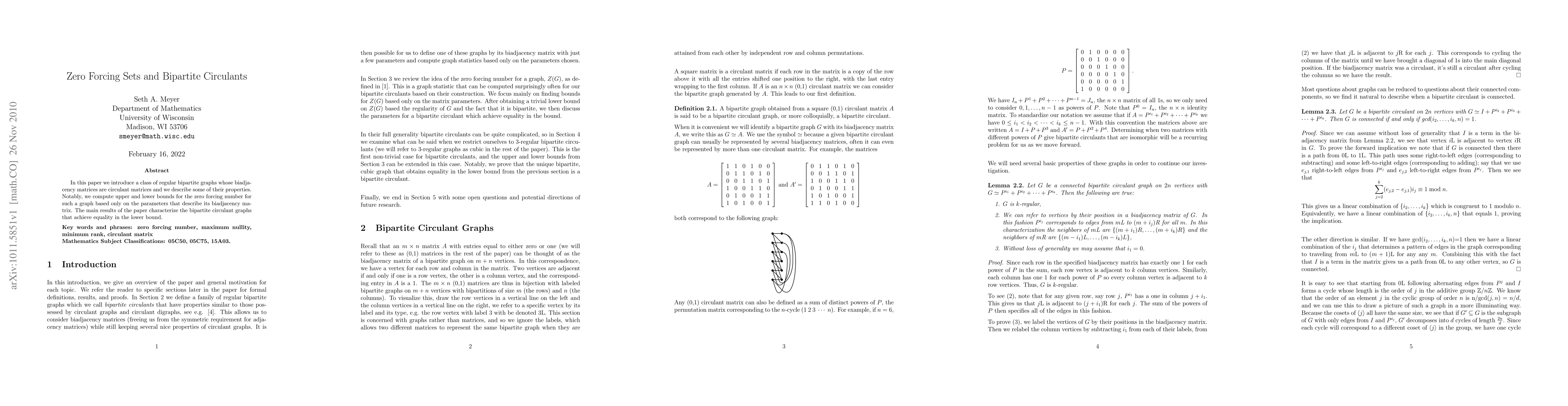 In this paper we introduce a class of regular bipartite graphs whose biadjacency matrices are circulant matrices and we describe some of their properties. Notably, we compute upper and lower bounds for the zero forcing number for such a graph based only on the parameters that describe its biadjacency matrix. The main results of the paper characterize the bipartite circulant graphs that achieve equality in the lower bound.