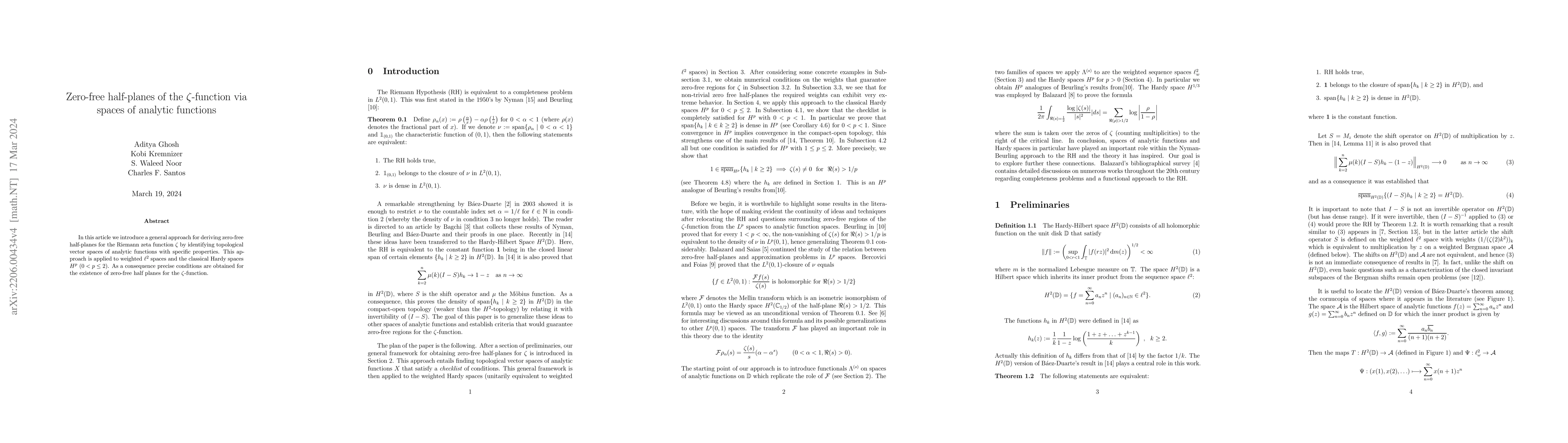 In this article, we introduce a general approach for deriving zero-free half-planes for the Riemann zeta function $\zeta$ by identifying topological vector spaces of analytic functions with specific properties. This approach is applied to weighted $\ell^2$ spaces and classical Hardy spaces $ H^p $ ($ 0