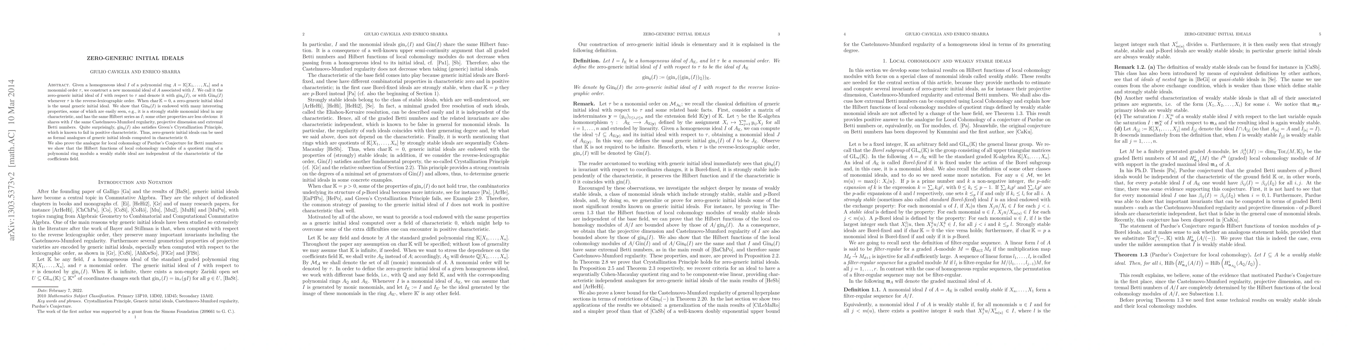 Given a homogeneous ideal I of a polynomial ring A=K[X_1,...,X_n] and a monomial order, we construct a new monomial ideal of A associated with I. We call it the zero-generic initial ideal of I with respect to the order and denote it with gin_0(I), or with Gin_0(I) whenever the order is the reverse-lexicographic order. When the characteristic of K is zero, a zero-generic initial ideal is the usual generic initial ideal. We show that Gin_0(I) is endowed with many interesting properties, some of which are easily seen, e.g., it is a strongly stable monomial ideal in any characteristic, and has the same Hilbert series as I; some other properties are less obvious: it shares with I the same Castelnuovo-Mumford regularity, projective dimension and extremal Betti numbers. Quite surprisingly, gin_0(I) also satisfies Green's Crystallization Principle, which is known to fail in positive characteristic. Thus, zero-generic initial ideals can be used as formal analogues of generic initial ideals computed in characteristic 0. We also prove the analogue for local cohomology of Pardue's Conjecture for Betti numbers: we show that the Hilbert functions of local cohomology modules of a quotient ring of a polynomial ring modulo a weakly stable ideal are independent of the characteristic of the coefficients field.