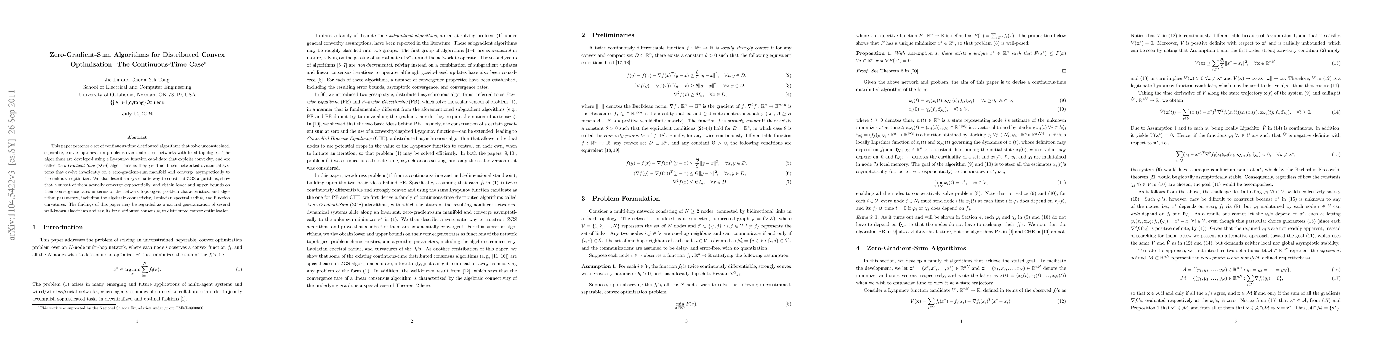This paper introduces continuous-time distributed algorithms called Zero-Gradient-Sum (ZGS) for solving convex optimization problems over networks, leveraging Lyapunov functions and achieving exponential convergence under certain conditions. The study provides bounds on convergence rates based on network topology and problem characteristics.