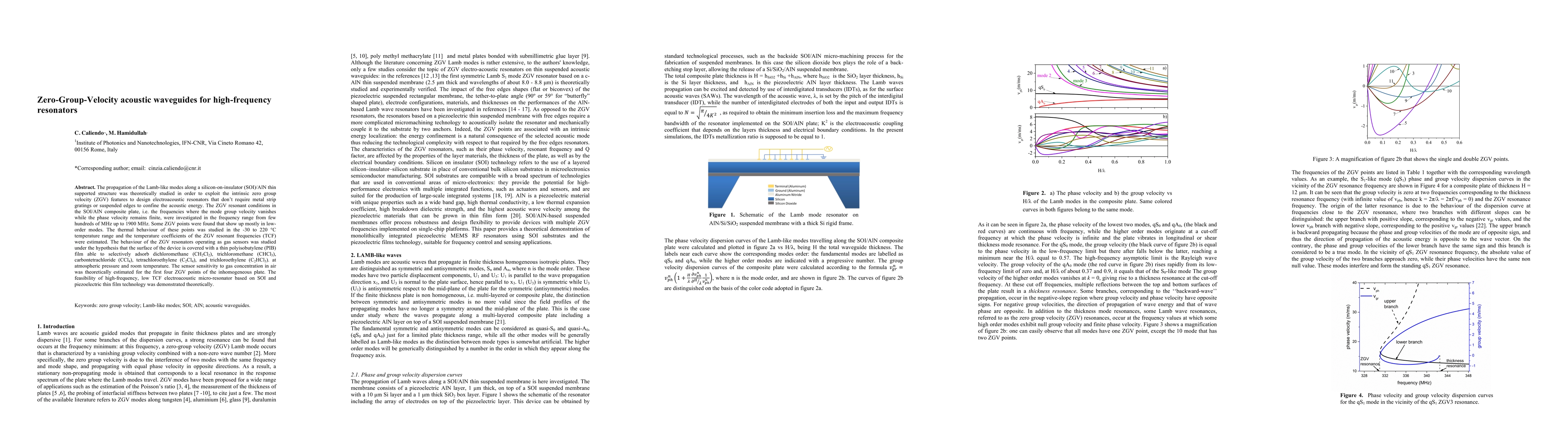 The propagation of the Lamb-like modes along a silicon-on-insulator (SOI)/AlN thin supported structure was theoretically studied in order to exploit the intrinsic zero group velocity (ZGV) features to design electroacoustic resonators that do not require metal strip gratings or suspended edges to confine the acoustic energy. The ZGV resonant conditions in the SOI/AlN composite plate, i.e. the frequencies where the mode group velocity vanishes while the phase velocity remains finite, were investigated in the frequency range from few hundreds of MHz up to 1900 MHz. Some ZGV points were found that show up mostly in low-order modes. The thermal behaviour of these points was studied in the -30 to 220 {\deg}C temperature range and the temperature coefficients of the ZGV resonant frequencies (TCF) were estimated. The behaviour of the ZGV resonators operating as gas sensors was studied under the hypothesis that the surface of the device is covered with a thin polyisobutylene (PIB) film able to selectively adsorb dichloromethane (CH2Cl2), trichloromethane (CHCl3), carbontetrachloride (CCl4), tetrachloroethylene (C2Cl4), and trichloroethylene (C2HCl3). at atmospheric pressure and room temperature. The sensor sensitivity to gas concentration in air was theoretically estimated for the first four ZGV points of the inhomogeneous plate. The feasibility of high-frequency, low TCF electroacoustic micro-resonator based on SOI and piezoelectric thin film technology was demonstrated theoretically.