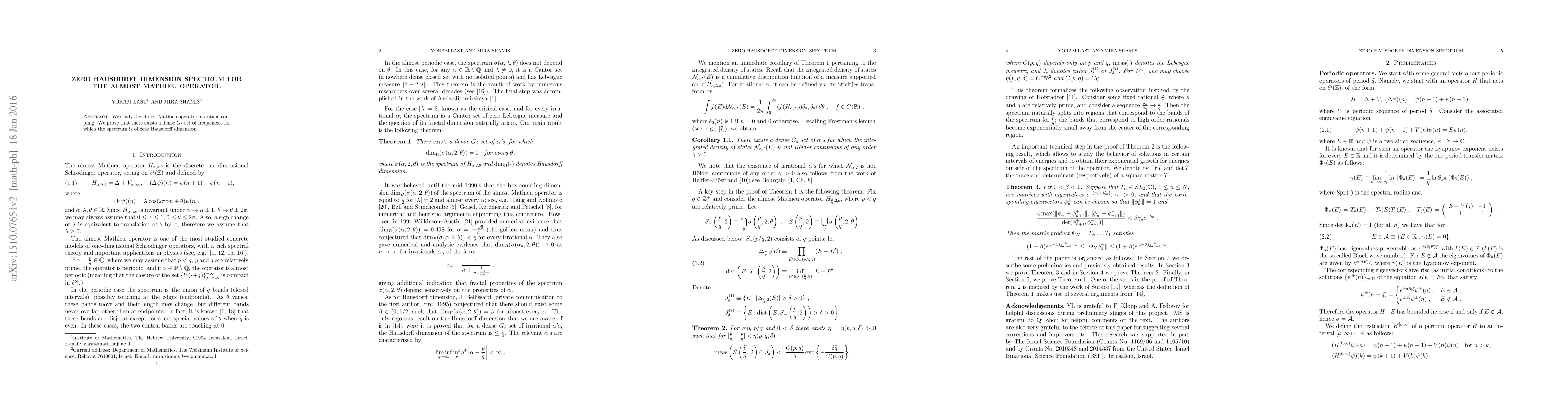 Summary: This paper investigates the almost Mathieu operator at its critical coupling, demonstrating that a dense $G_\delta$ set of frequencies yields a spectrum with zero Hausdorff dimension. This finding highlights the complex structure of the operator's spectrum.