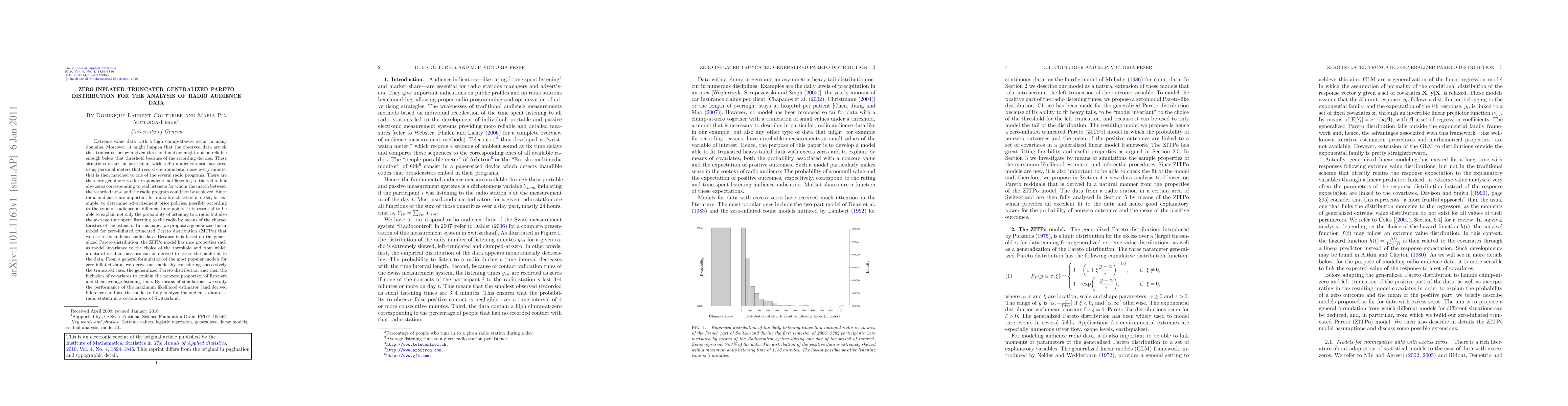 This paper proposes a zero-inflated truncated generalized Pareto distribution (ZITPo) model to analyze radio audience data, which often contains extreme values and zeros due to recording limitations. The model is used to fit and explain the probability of listening to the radio and the average listening time, providing insights for advertisers.