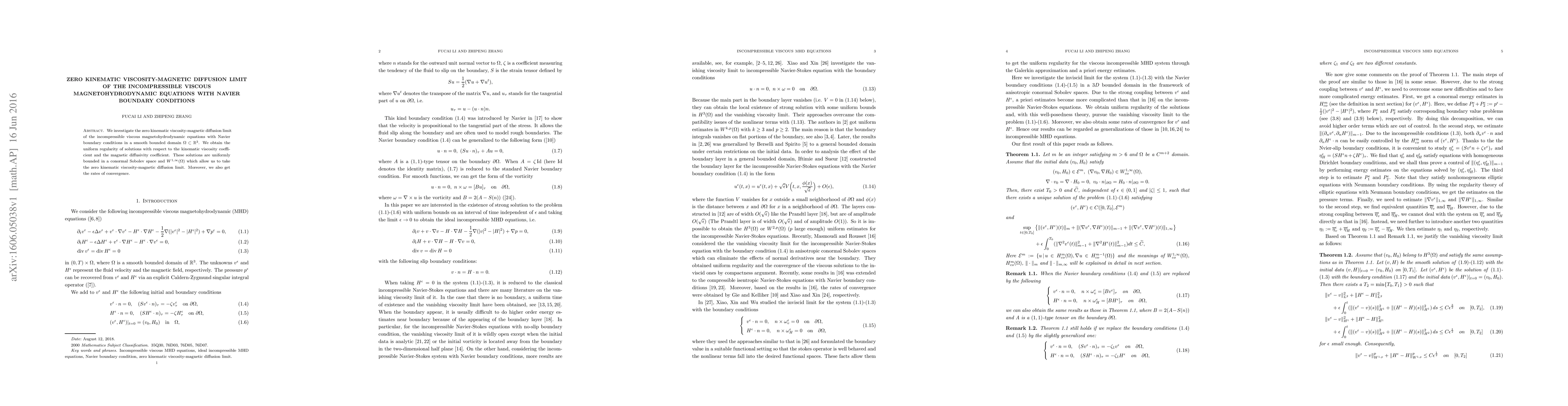 This paper studies the limit behavior of incompressible viscous magnetohydrodynamic equations as both kinematic viscosity and magnetic diffusion approach zero, with Navier boundary conditions in a bounded domain. The authors prove uniform regularity and boundedness of solutions, enabling the derivation of convergence rates for the zero viscosity-diffusion limit.