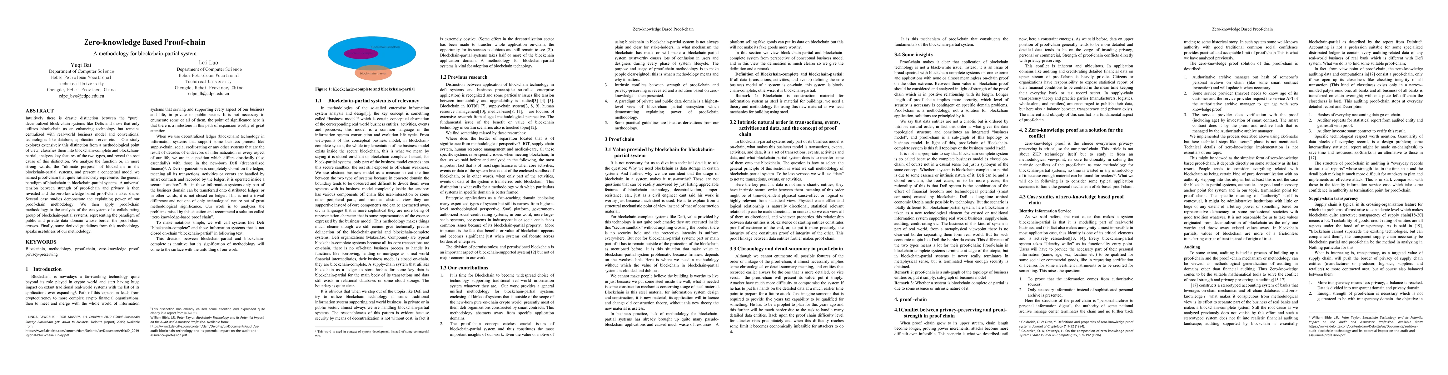 Intuitively there is a drastic distinction between the pure decentralized block-chain systems like Defis and those that only utilize block-chain as an enhancing technology but remain centralized with real-world business model and conventional technologies like database, application server, etc. Our study explores extensively this distinction from a methodological point of view, classifies them into blockchain-complete and blockchain-partial, analyzes key features of the two types, and reveals the root cause of this distinction. We analyze the function or, in more strong words, the "ultimate purpose" of blockchain in the blockchain-partial systems, and present a conceptual model we named proof-chain that quite satisfactorily represented the general paradigm of blockchain in blockchain-partial systems. A universal tension between strength of proof-chain and privacy is then revealed and the zero-knowledge based proof-chain takes shape. Several case studies demonstrate the explaining power of our proof-chain methodology. We then apply proof-chain methodology to the analysis of the ecosystem of a collaborating group of blockchain-partial systems, representing the paradigm of public and private data domain whose border the proof-chain crosses. Finally, some derived guidelines from this methodology speak usefulness of our methodology.