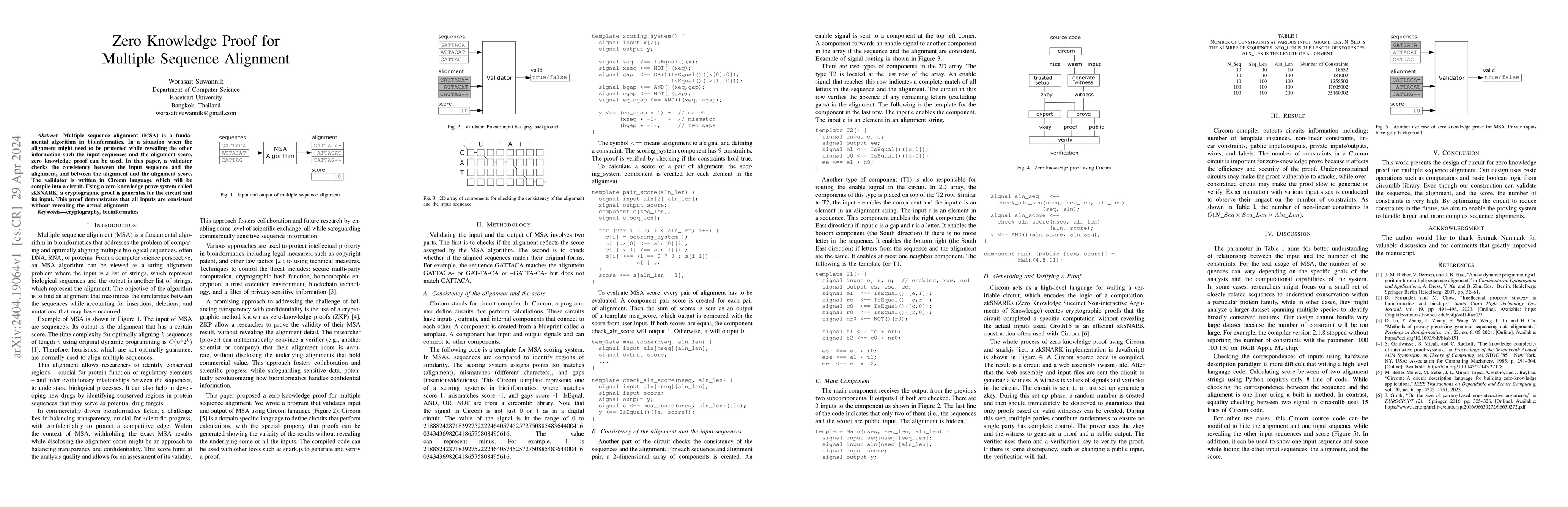 This paper proposes a zero knowledge proof system for multiple sequence alignment (MSA) to verify consistency without exposing the actual alignment. Using Circom and zkSNARK, it generates cryptographic proofs that validate input sequences and alignment scores without revealing the alignment itself.